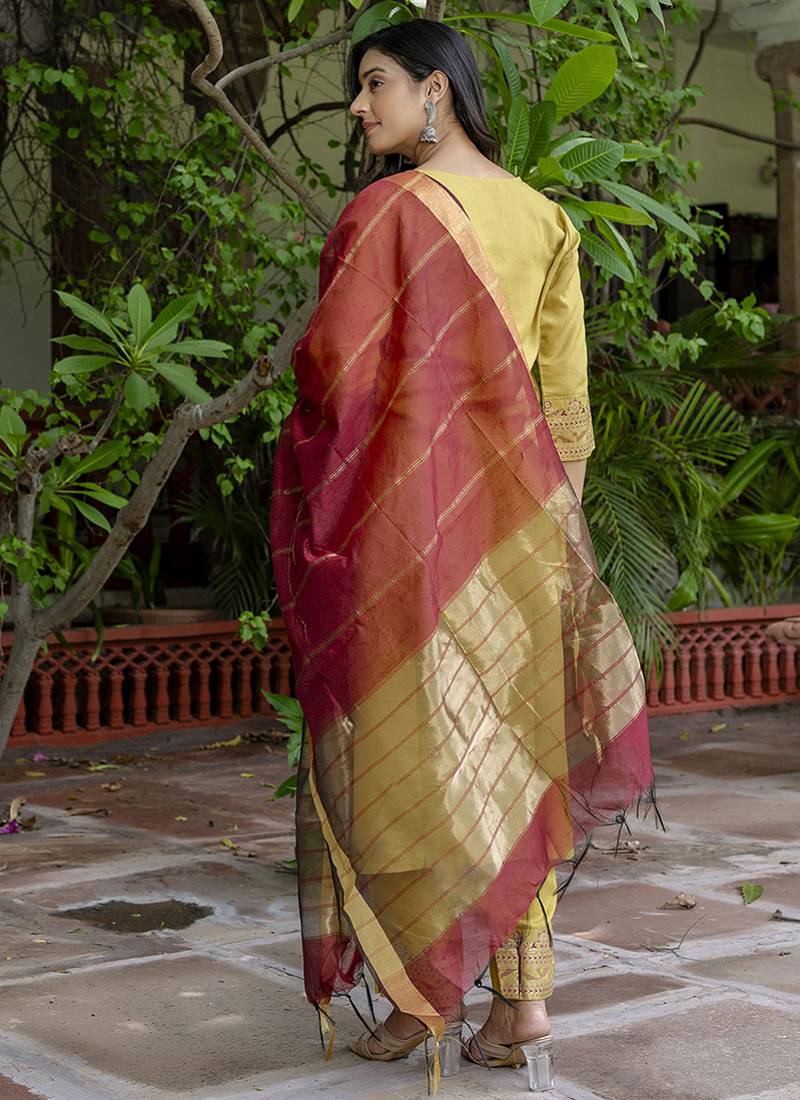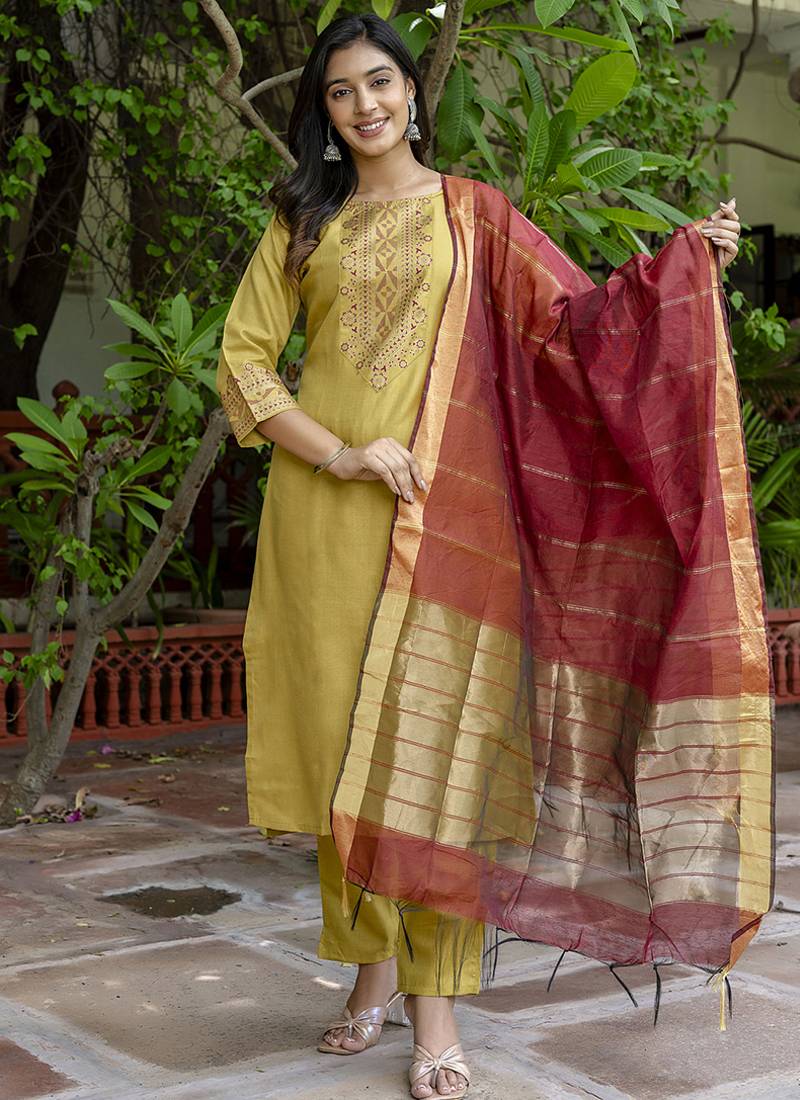 | Product Description | Cotton Blend Mustard Yellow Casual Wear Foil Print Work Readymade Salwar Suit |