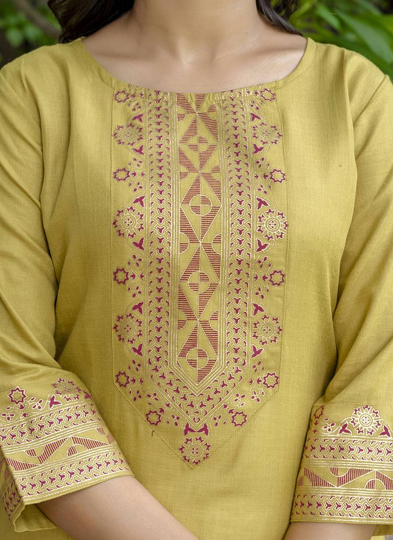 | Product Name | Cotton Blend Mustard Yellow Casual Wear Foil Print Work Kurta Set | |