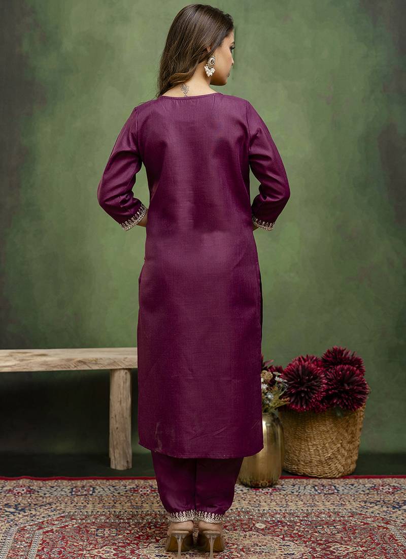 Cotton blend wine casual wear embroidery work kurta set