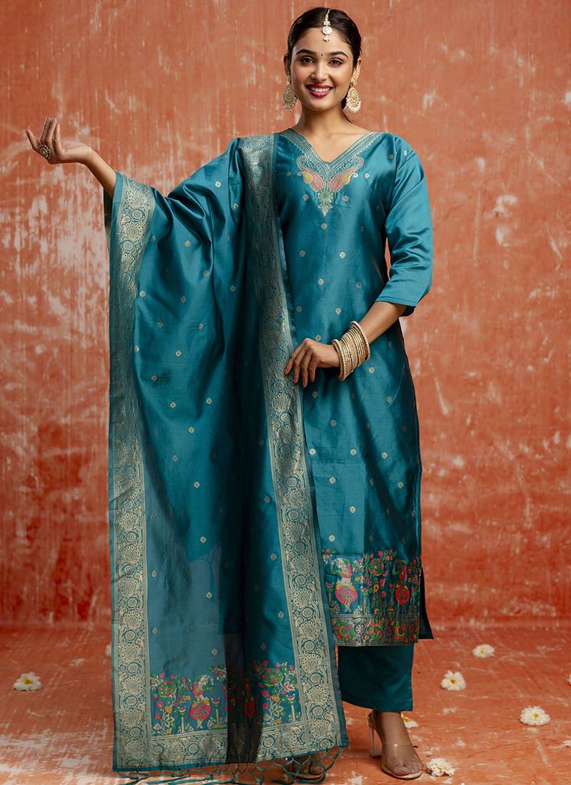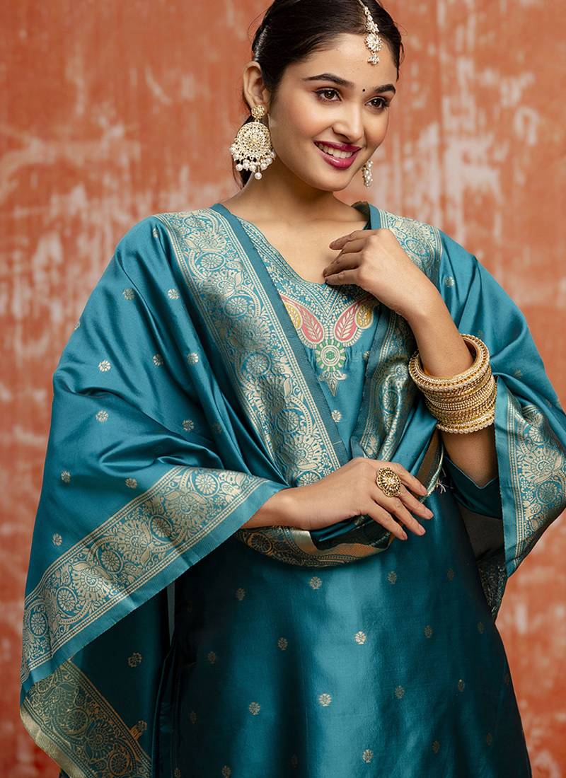 | Product Description | Unique Rama Shade Cotton Silk Blend Suit With Rich Zari Work, Perfect For Festive Wear. |