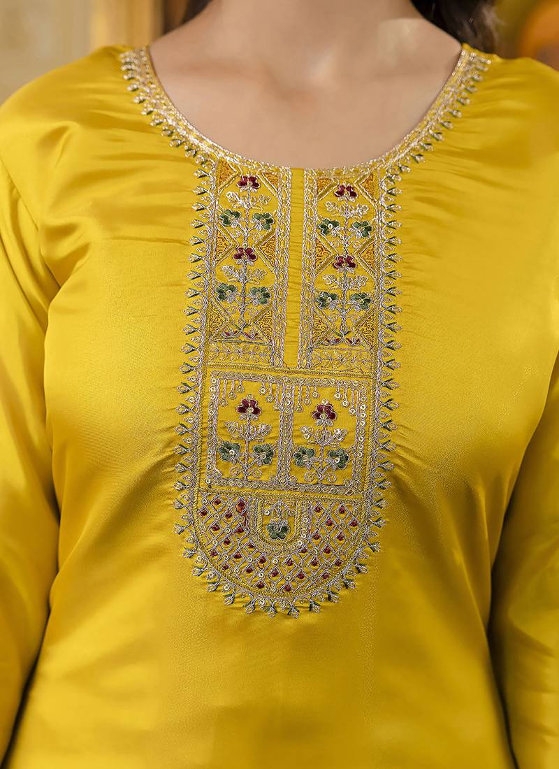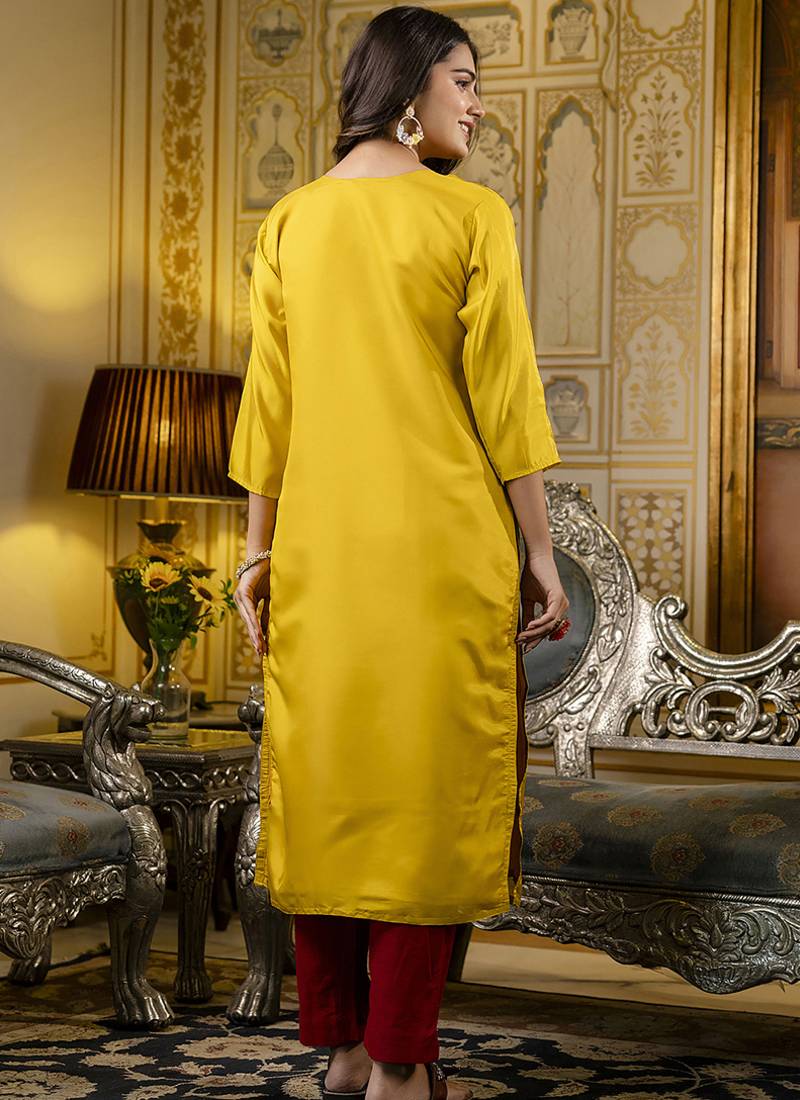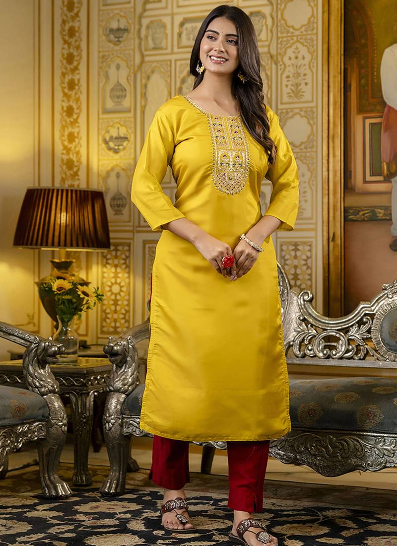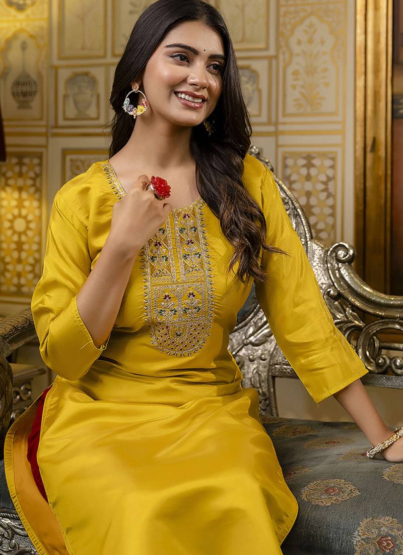 Shimmer silk mustard casual wear embroidery work readymade kurti