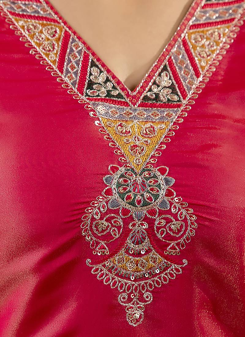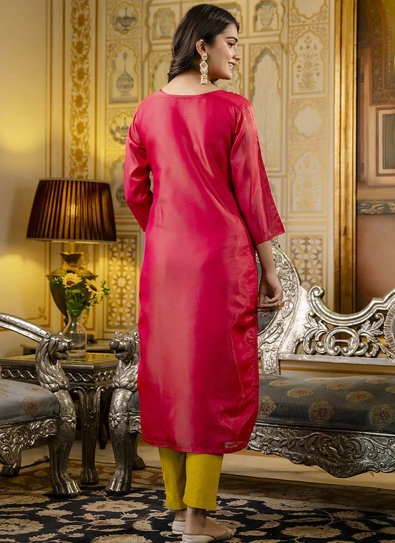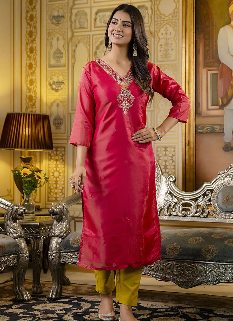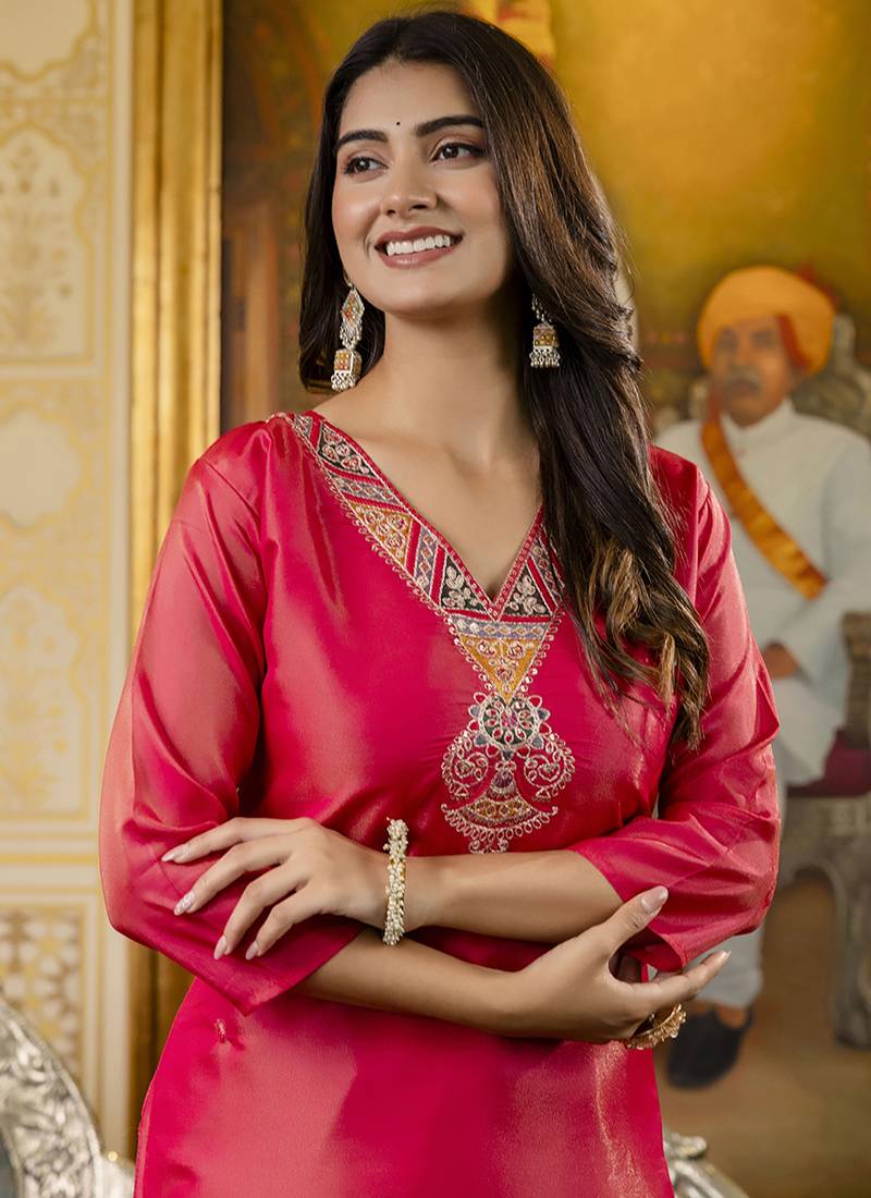 | Product Description | Shimmer Silk Rani Casual Wear Embroidery Work Readymade Kurti |
