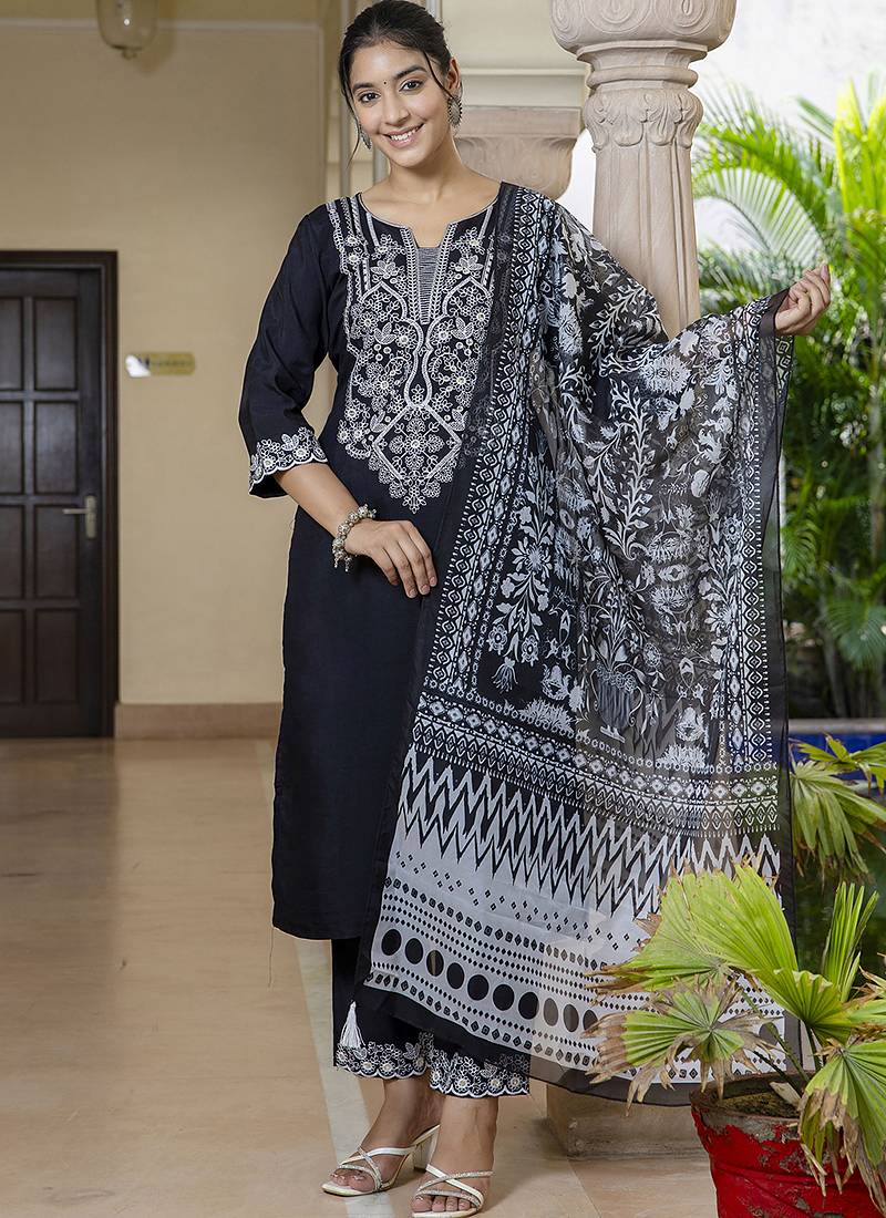 | Product Description | Silk Blend Black Casual Wear Embroidery Work Readymade Salwar Suit |