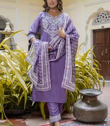 | Product Description | Silk Blend Lavender Casual Wear Embroidery Work Readymade Salwar Suit |