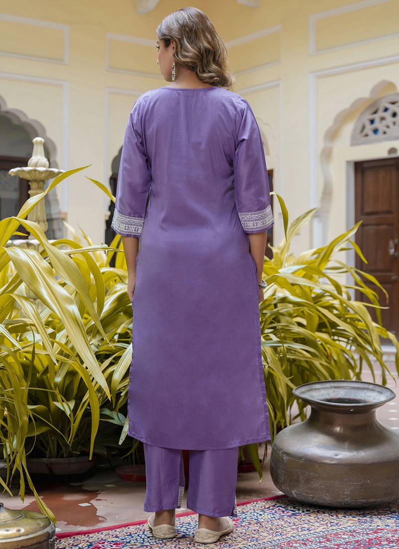 Silk blend lavender casual wear embroidery work kurta set