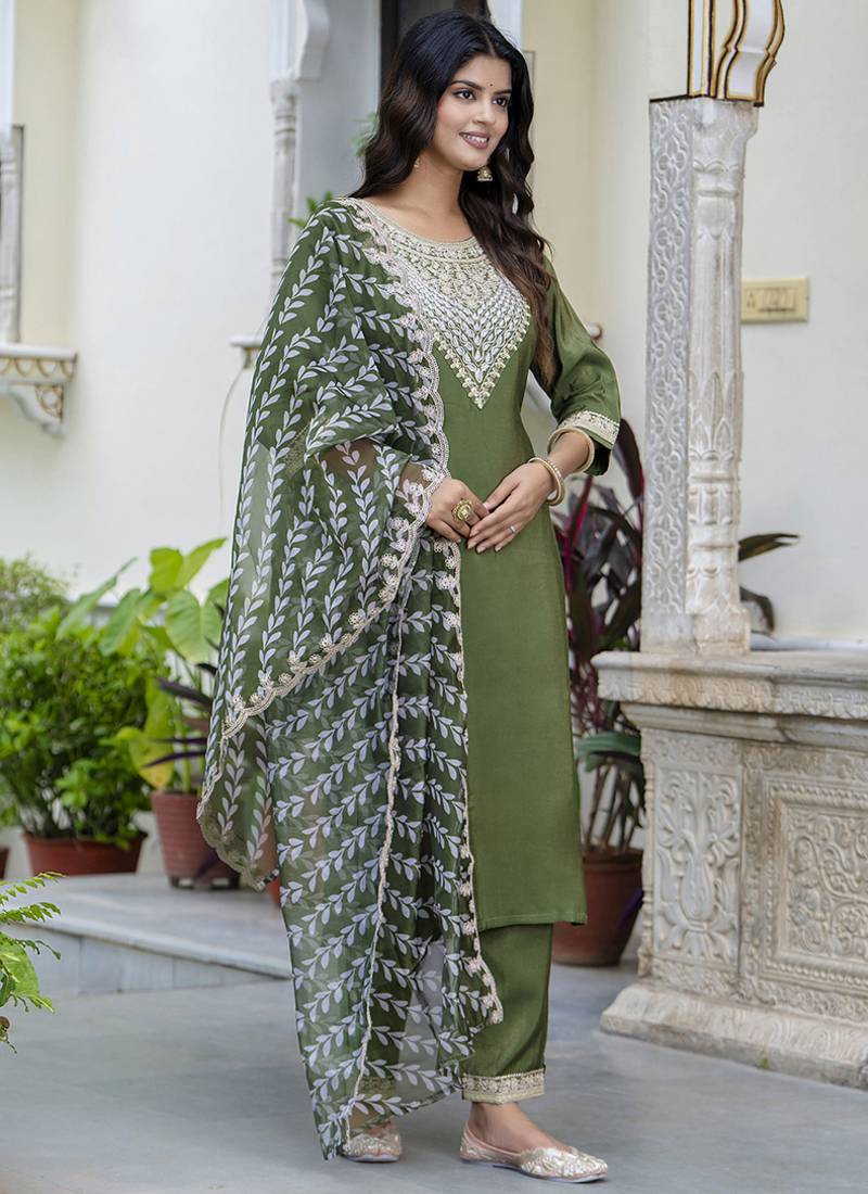 | Product Description | Silk Blend Olive Green Casual Wear Embroidery Work Readymade Salwar Suit |