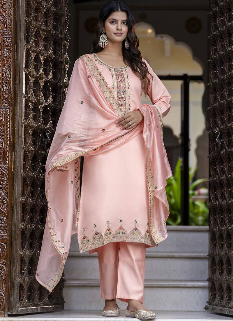 | Product Description | Silk Blend Peach Occasional Wear Embroidery Work Readymade Salwar Suit |