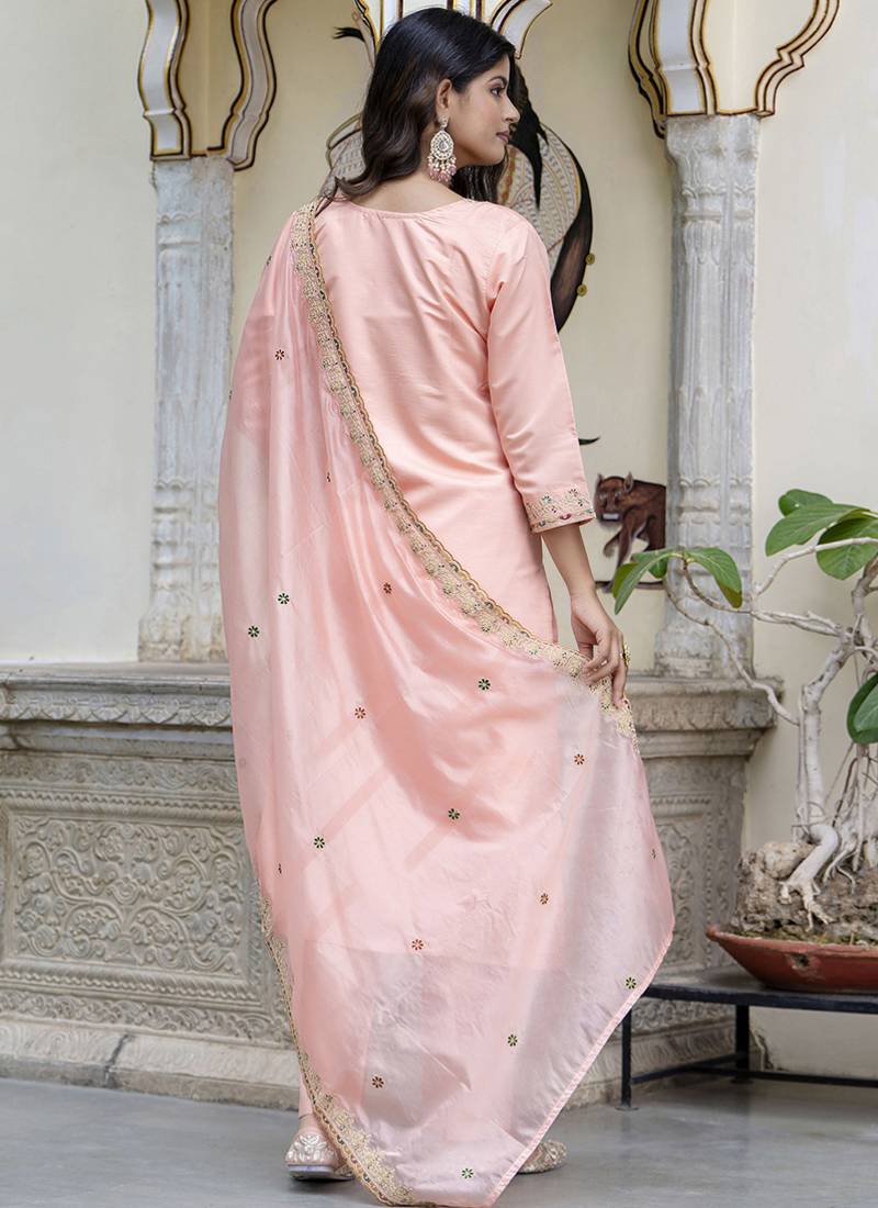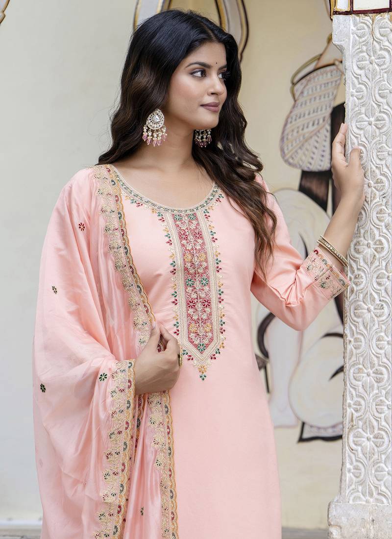 Silk blend peach occasional wear embroidery work kurta set