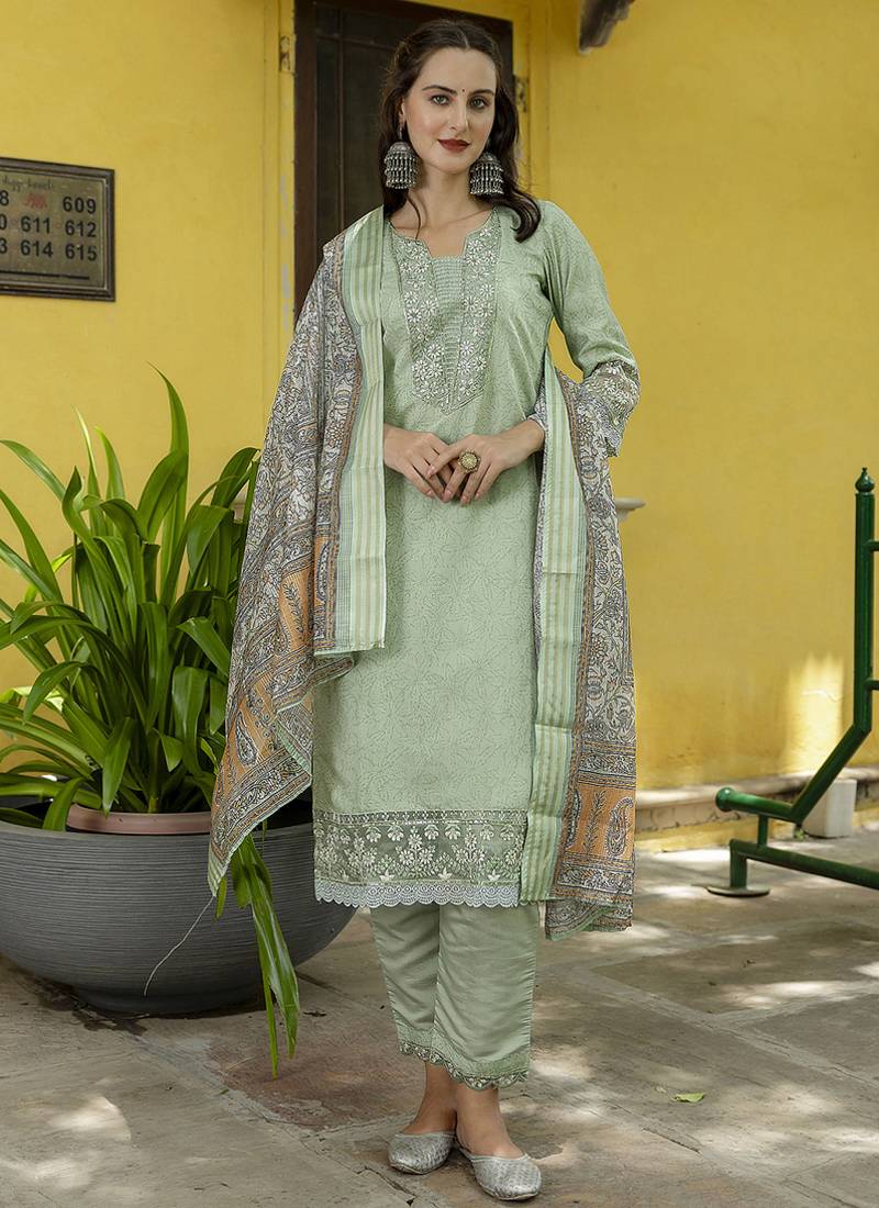 | Product Description | Silk Blend Pista Casual Wear Embroidery Work Readymade Salwar Suit |