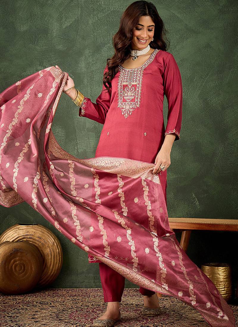 Viscose rayon pink casual wear embroidery work kurta set