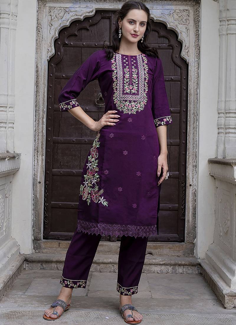 | Product Name | Viscose Roman Silk Deep Purple Ocassional Wear Embroidery Work Kurta Set | |