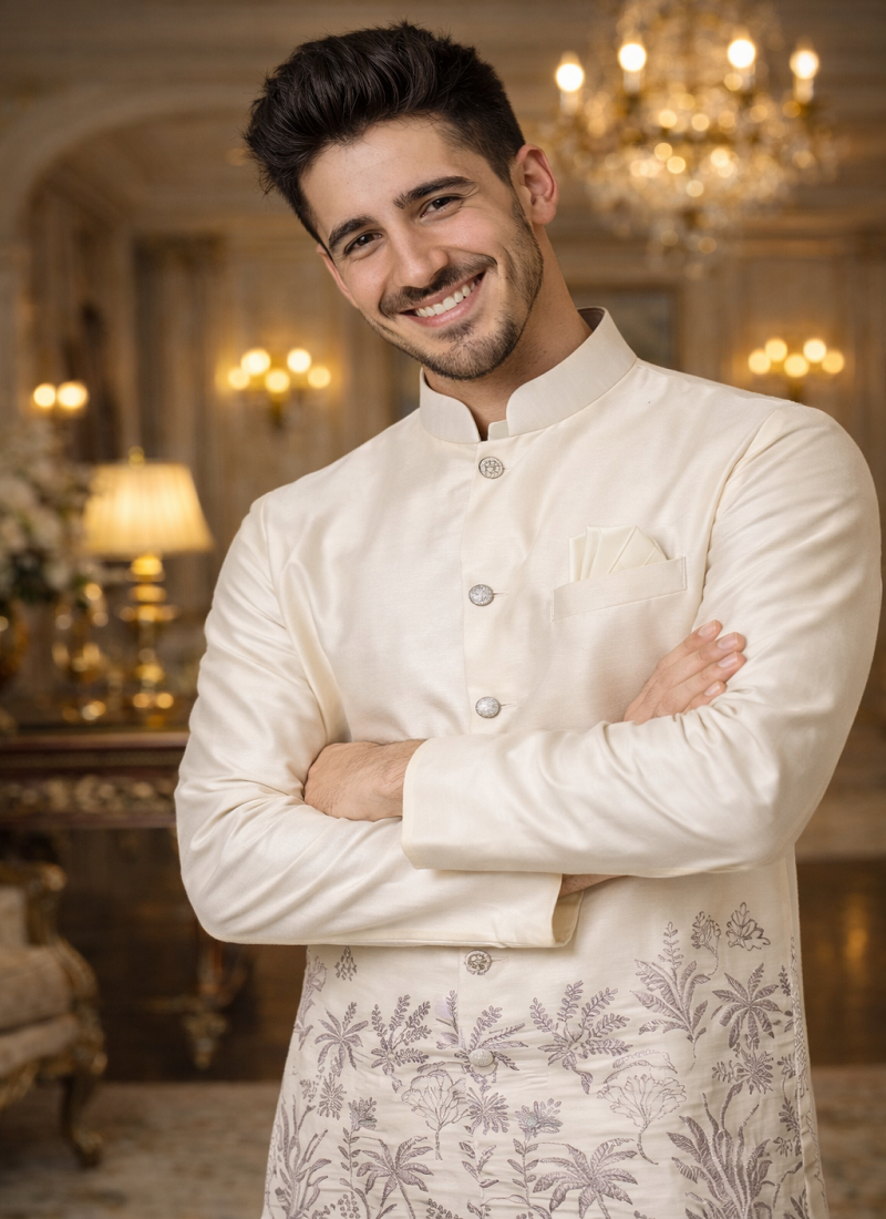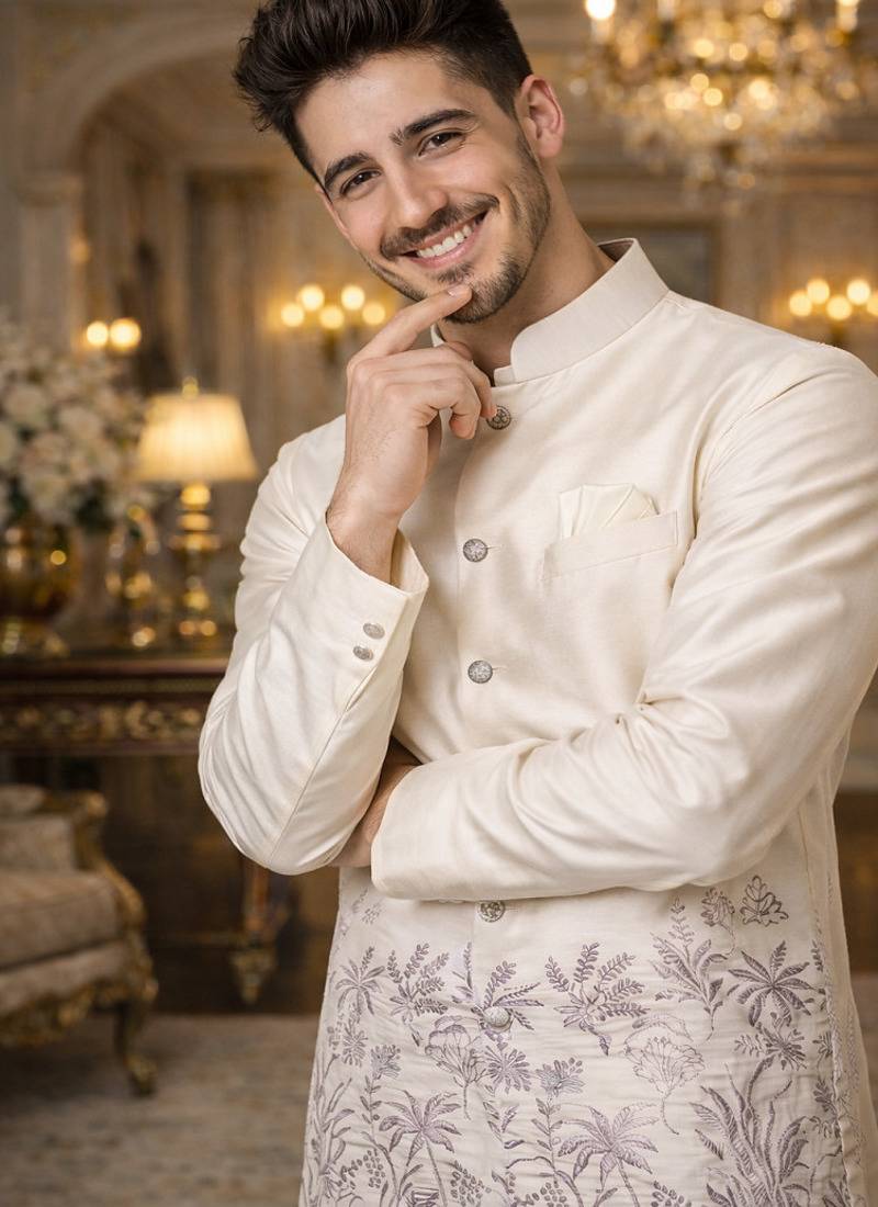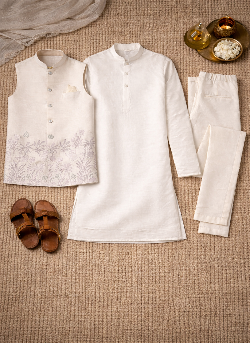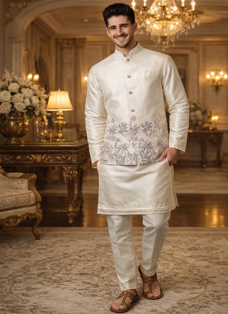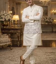 | Product Name | Off White Color Embroidery Sequence Work Slub Silk Kurta Koti Pant Set | |