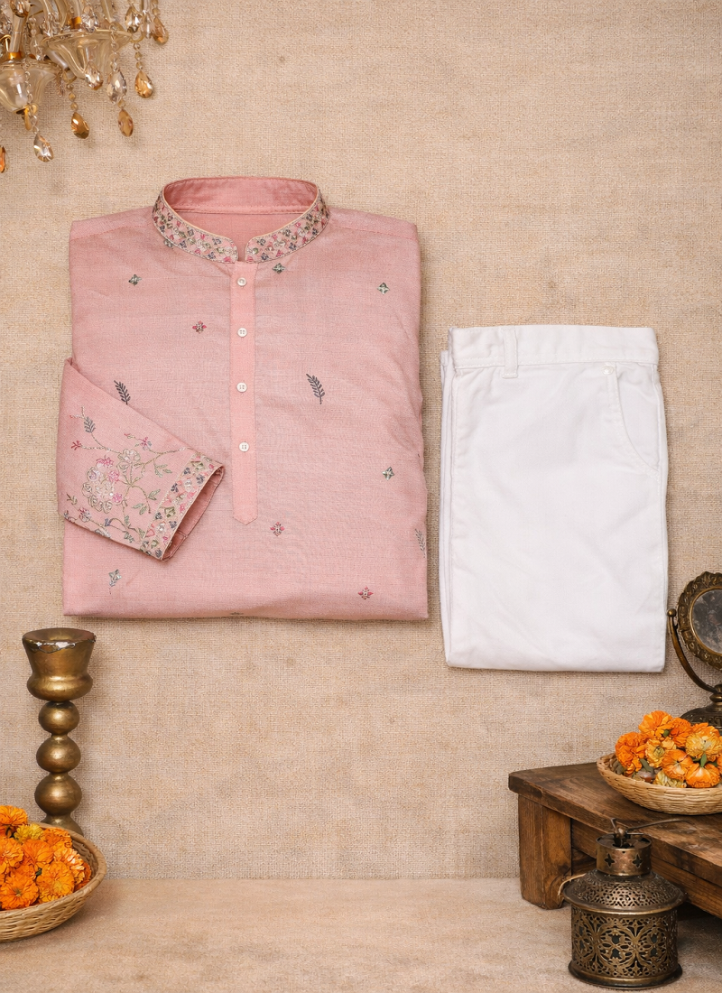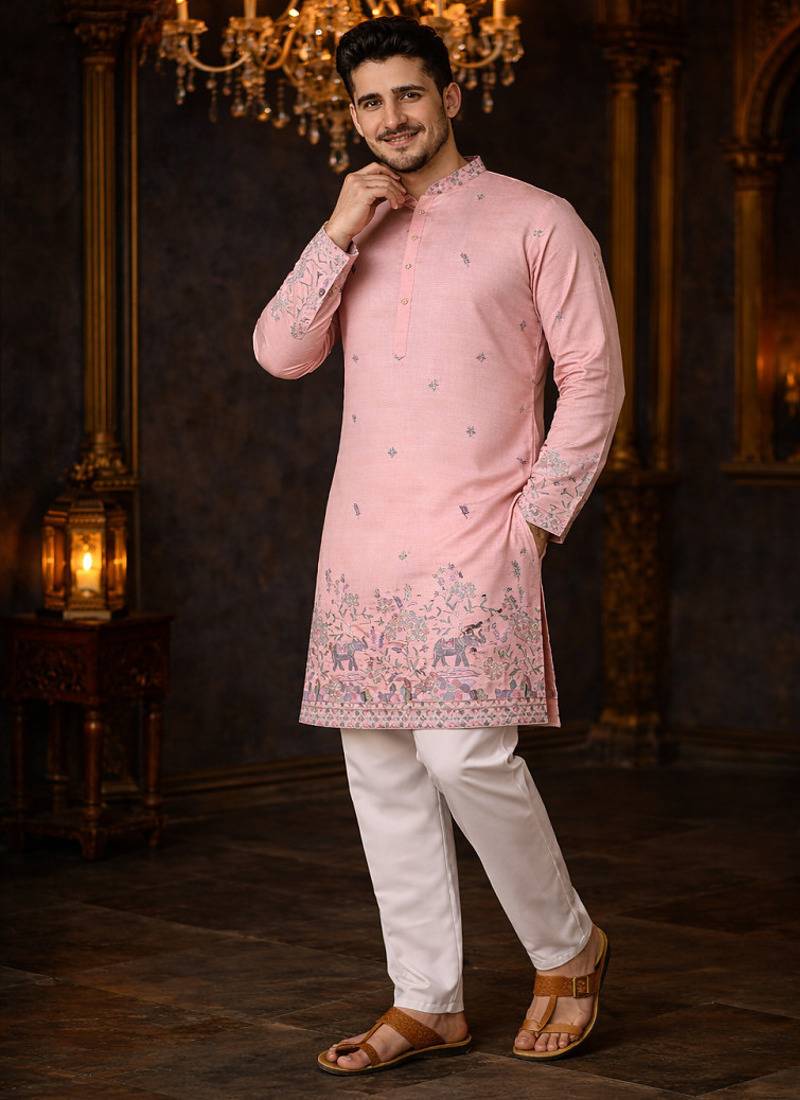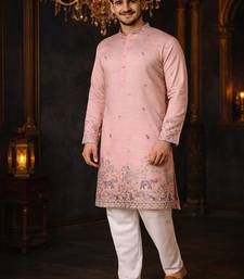 Pink color embroidery sequence work linen cotton kurta payjama set