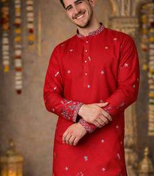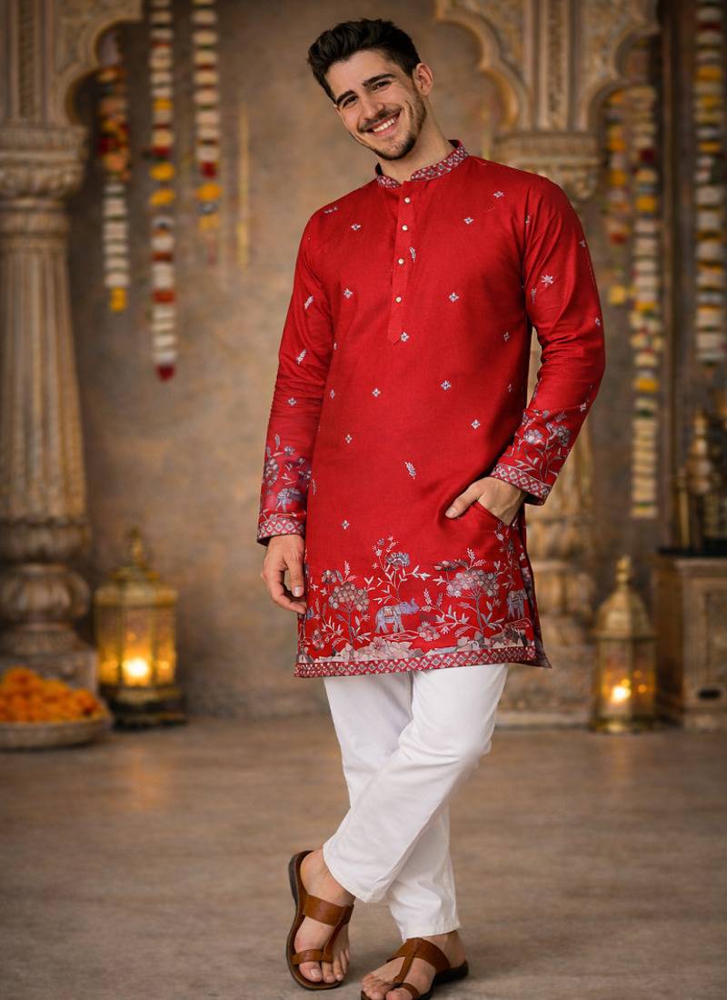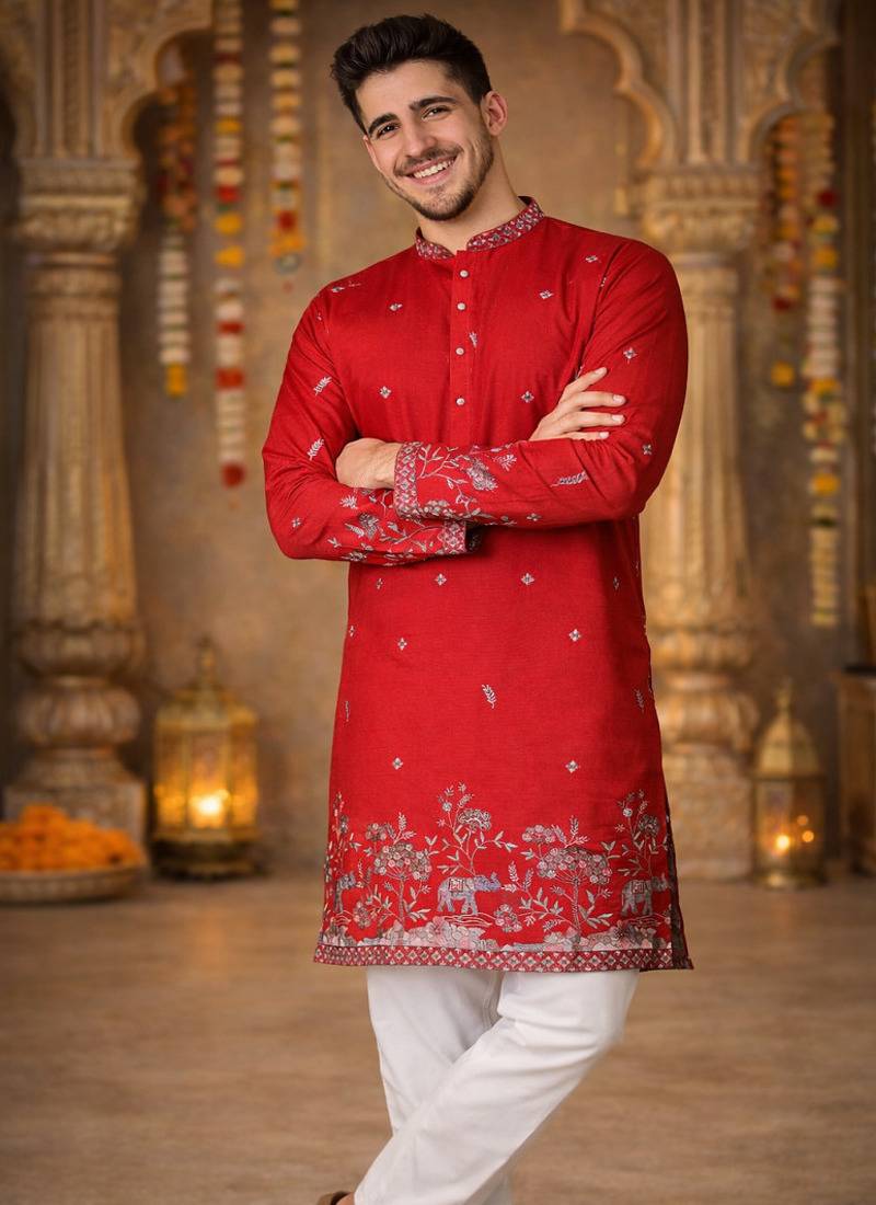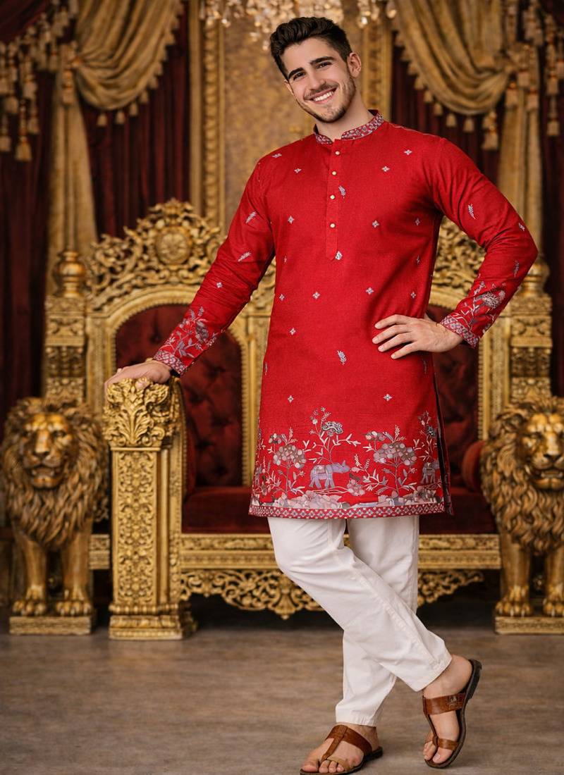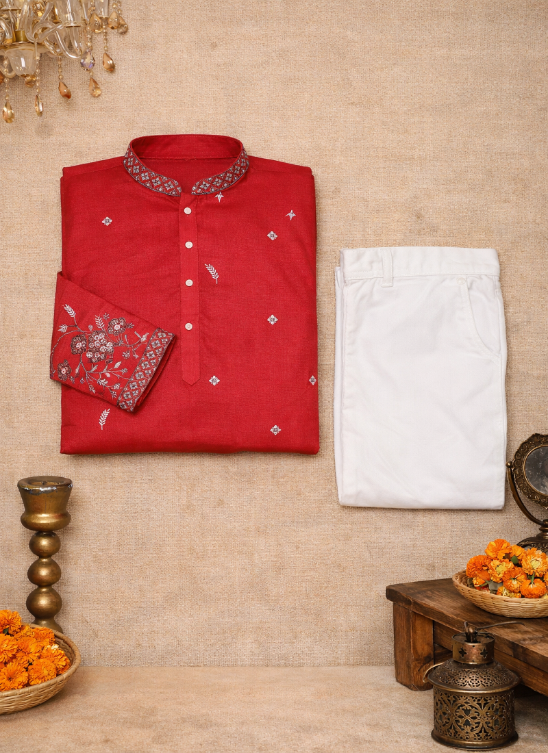 | Product Name | Red Color Embroidery Sequence Work Linen Cotton Kurta Payjama Set | |