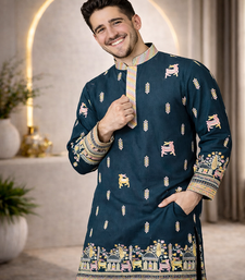 Teal color multi thread embroidery work silk kurta payjama set