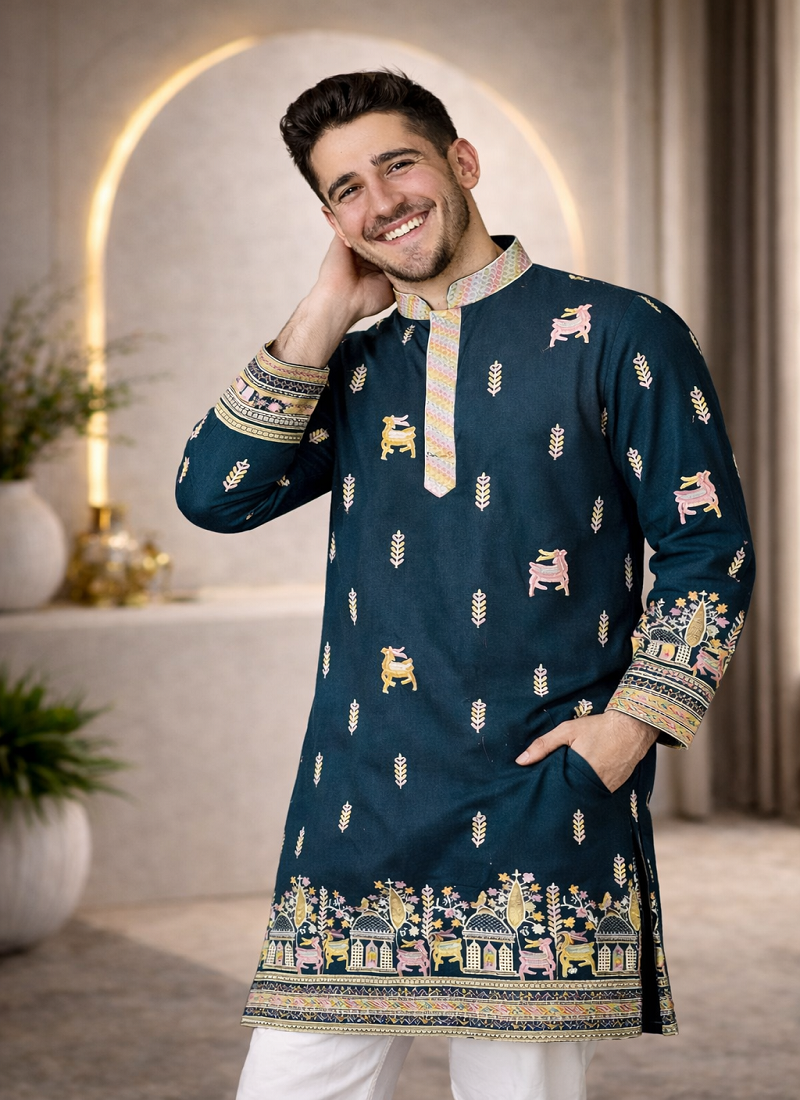| Product Name | Teal Color Multi Thread Embroidery Work Silk Kurta Payjama Set | |