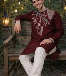 Wine color embroidery sequence work viscose silk kurta payjama set