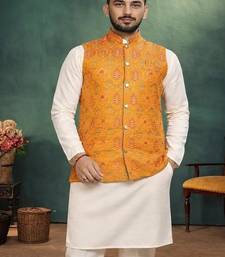 | Product Description | Yellow Color Koti Kurta Pajama Set Made From Cotton And Silk Fabric That Gives A Comfortable Feel With A Rich Look. The Koti Features Detailed Jacquard Weaving Work That Adds Texture And Traditional Style To The Outfit. The Kurta And Pajama Come In A Matching Light Shade That Balances The Bright Yellow Koti Beautifully. Yellow Color Jacquard Weaving Work Cotton And Silk Koti Kurta Pajama Set Is A Great Choice For Festive Wear, Weddings, And Cultural Functions. Comfortable Fabric And Classic Design Make This Outfit Perfect For Special Occasions And Celebrations. |