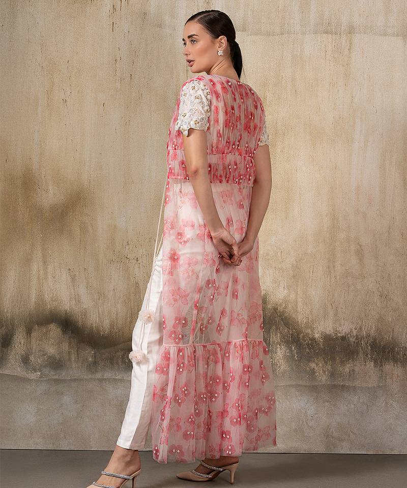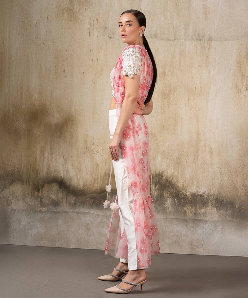| Product Description | This Elegant Outfit Features An Ivory Hand Embroidered Crop Top Detailed With Pearls, Beads, And 3 D Floral Motifs. It Is Paired With Tailored High Waist White Pants For A Sleek And Modern Silhouette. The Look Is Completed With A Sheer Pink Printed Net Shrug With Delicate Floral Tie Up Tassels.
