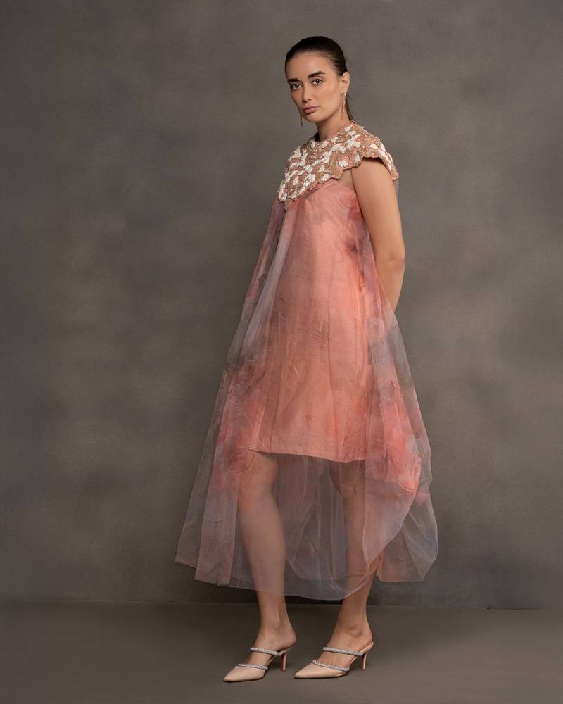 | Product Description | This Pastel Peach Dress Is Crafted In Printed Net As A Soft Sheer Overlay That Gives It A Flowy, Ethereal Feel. The Neckline Is Highlighted With Scalloped Floral Embroidery In Ivory And Beige, Adding A Touch Of Elegance. Designed With A Sleeveless Cut And Layered Asymmetric Hemline.