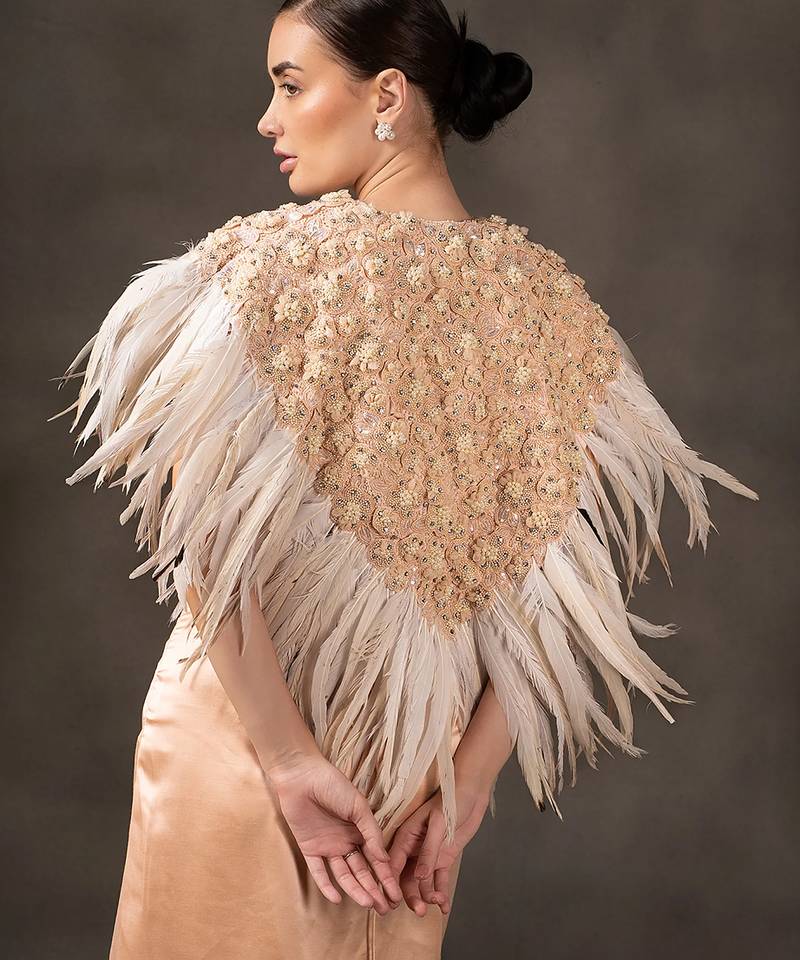 | Product Description | This Peach Ensemble Features A Silky Drape Skirt With Soft Pleats And Delicate Lace Detailing At The Hem. It Is Styled With A Sheer Embroidered Blouse, Adding Subtle Elegance. The Highlight Is The Dramatic Cape Adorned With Intricate Floral Work And Cascading Feathers, Creating A Modern Yet Couture Statement.