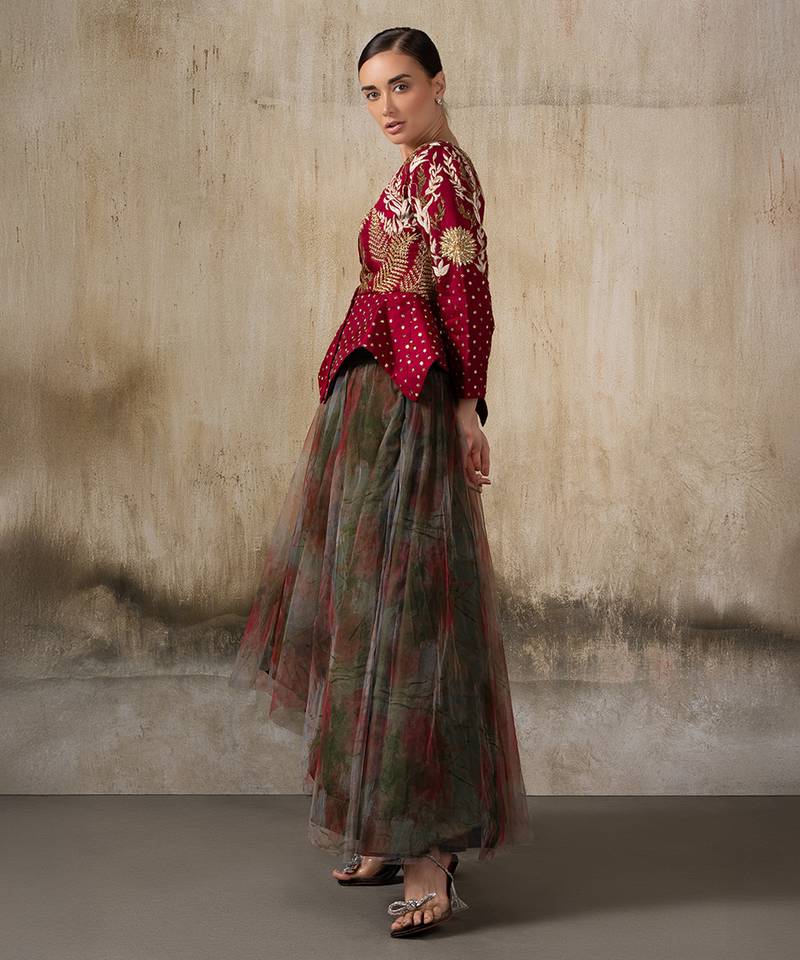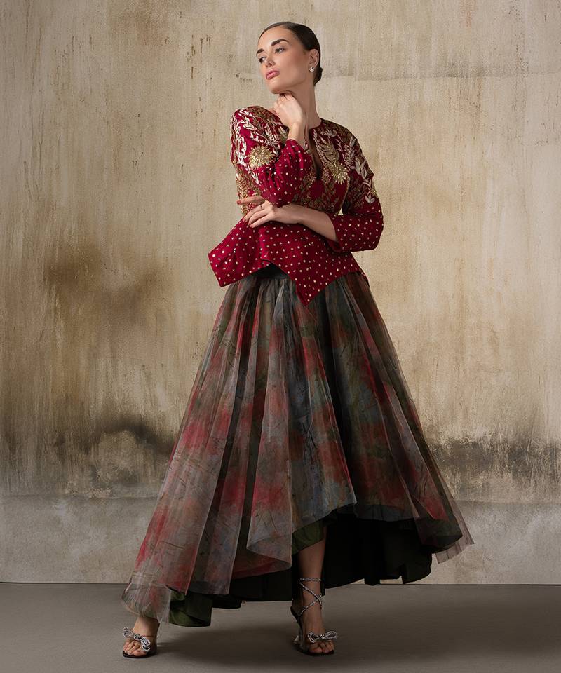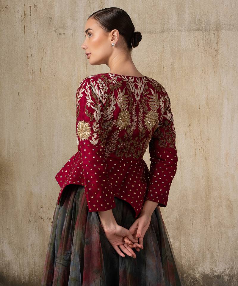 | Product Description | This Elegant Ensemble Features A Wine Red Peplum Jacket Richly Adorned With Golden Thread Embroidery, Floral Motifs, And Delicate Sequin Highlights. The Structured Jacket Is Balanced With A Flared Tulle Skirt In Muted Watercolor Style Prints, Adding Depth And Fluidity. The Sheer Overlay Creates A Dreamy Layered Effect, While The Fitted Bodice Enhances Sophistication.