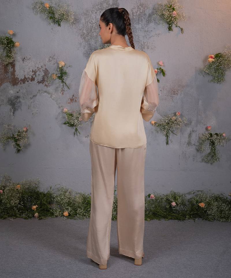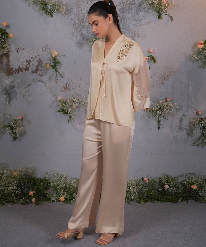 Beige embroidered satin co ord set