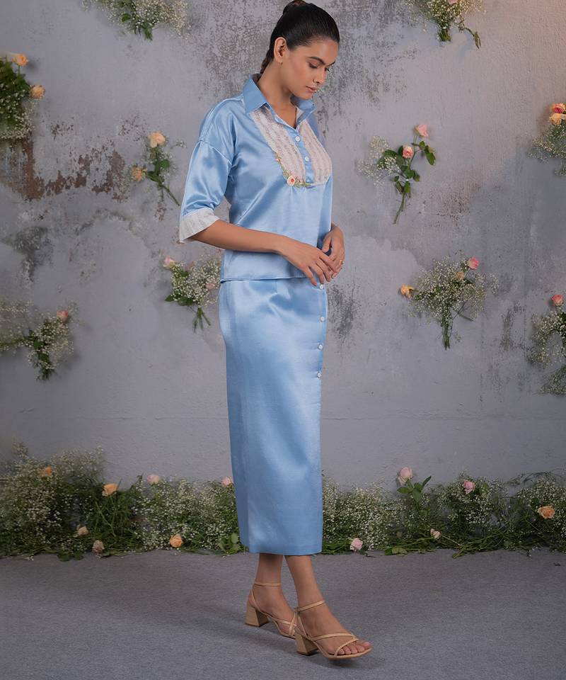 | Product Name | Blue Embroidered Silk Co Ord Set | |