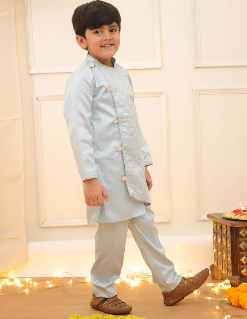 | Product Name | Blue Embroidered Silk Blend Kurta Pyjama Set For Boy | |
