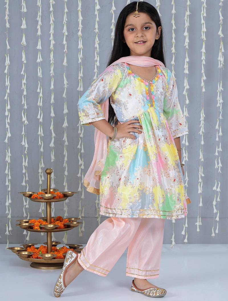 | Product Name | Peach Foil Print Silk Kurti Palazzo Pent With Dupatta Set For Girls | |