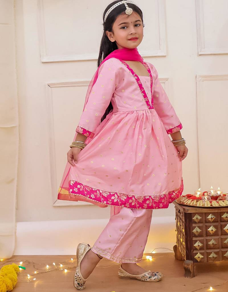 Pink woven taffeta anarkali-pant with dupatta set for girls