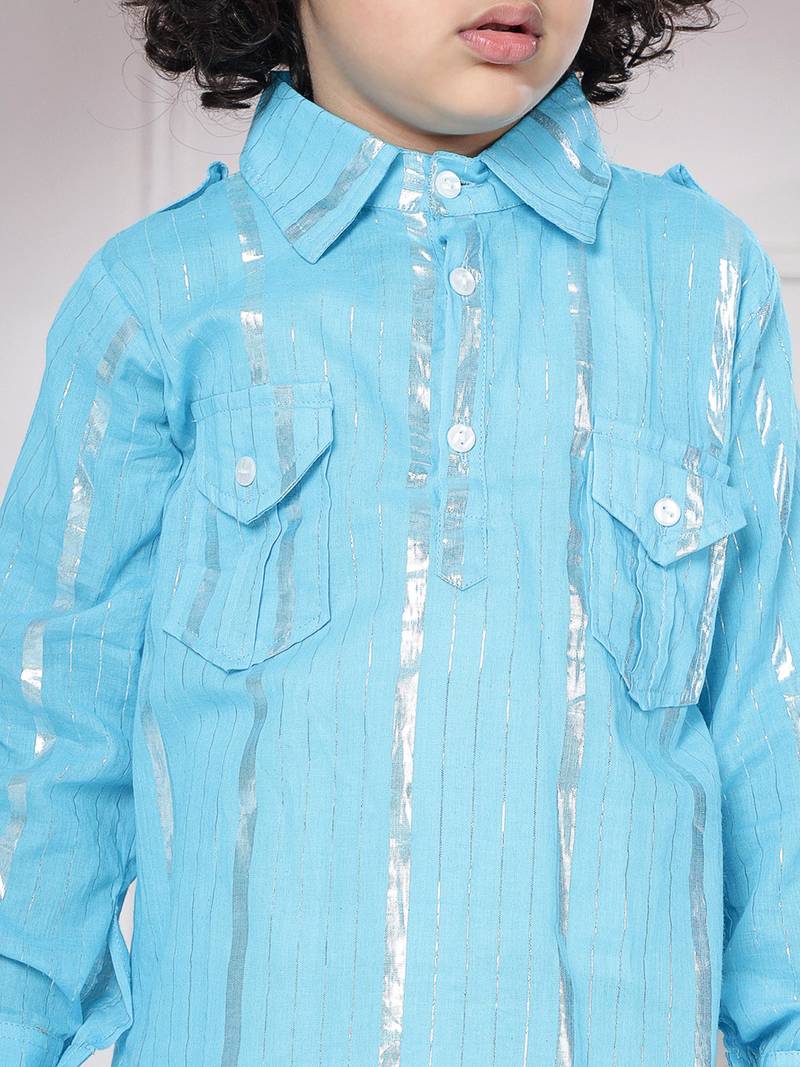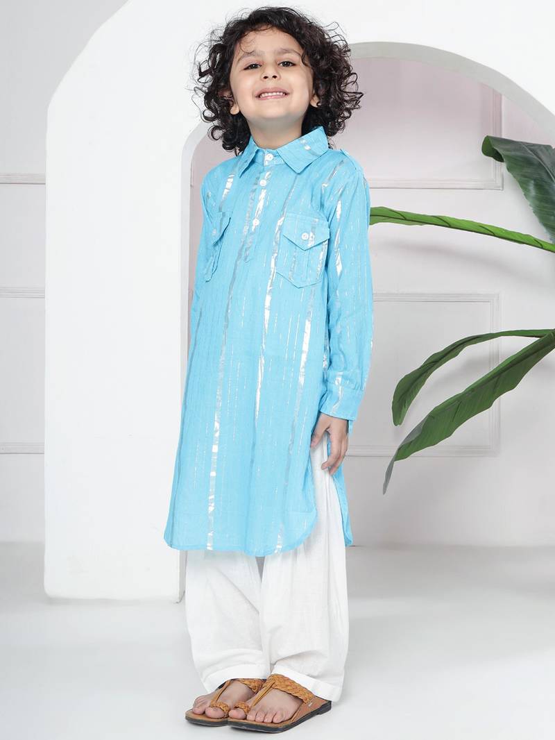 Sky blue woven lurex cotton pathani with salwar set for boy