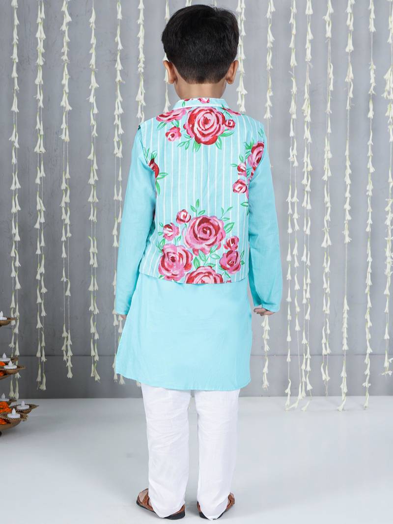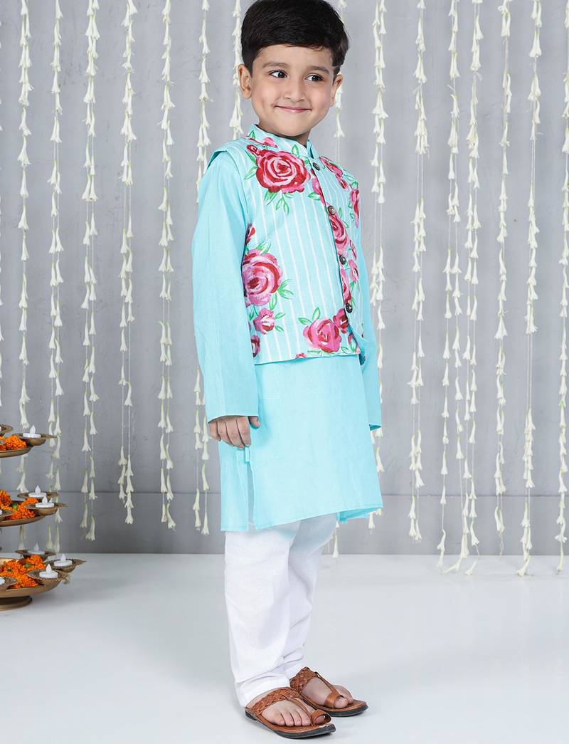 | Product Name | Turquoise Printed Cotton Jacket With Kurta Pyjama Set For Boy | |