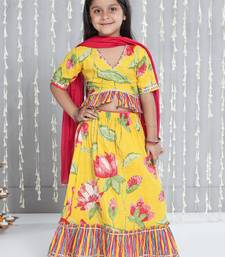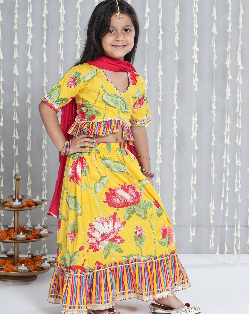 Yellow printed cotton lehenga choli with dupatta set for girls