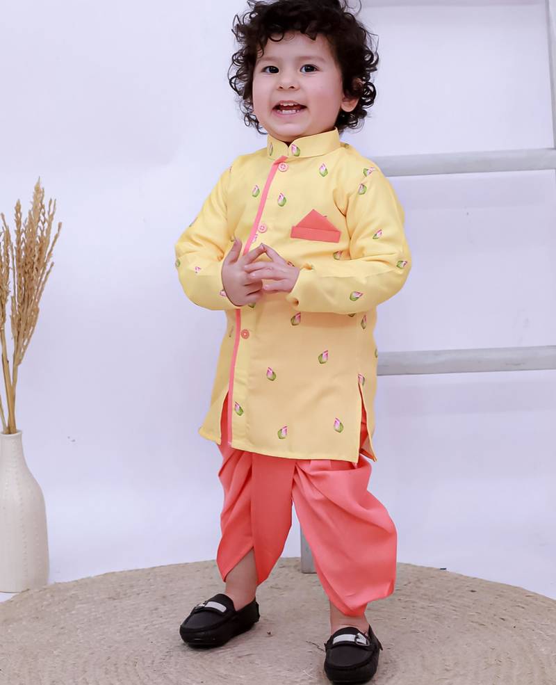 Yellow printed silk kurta with dhoti set for boy