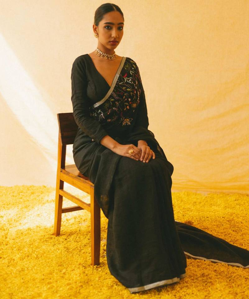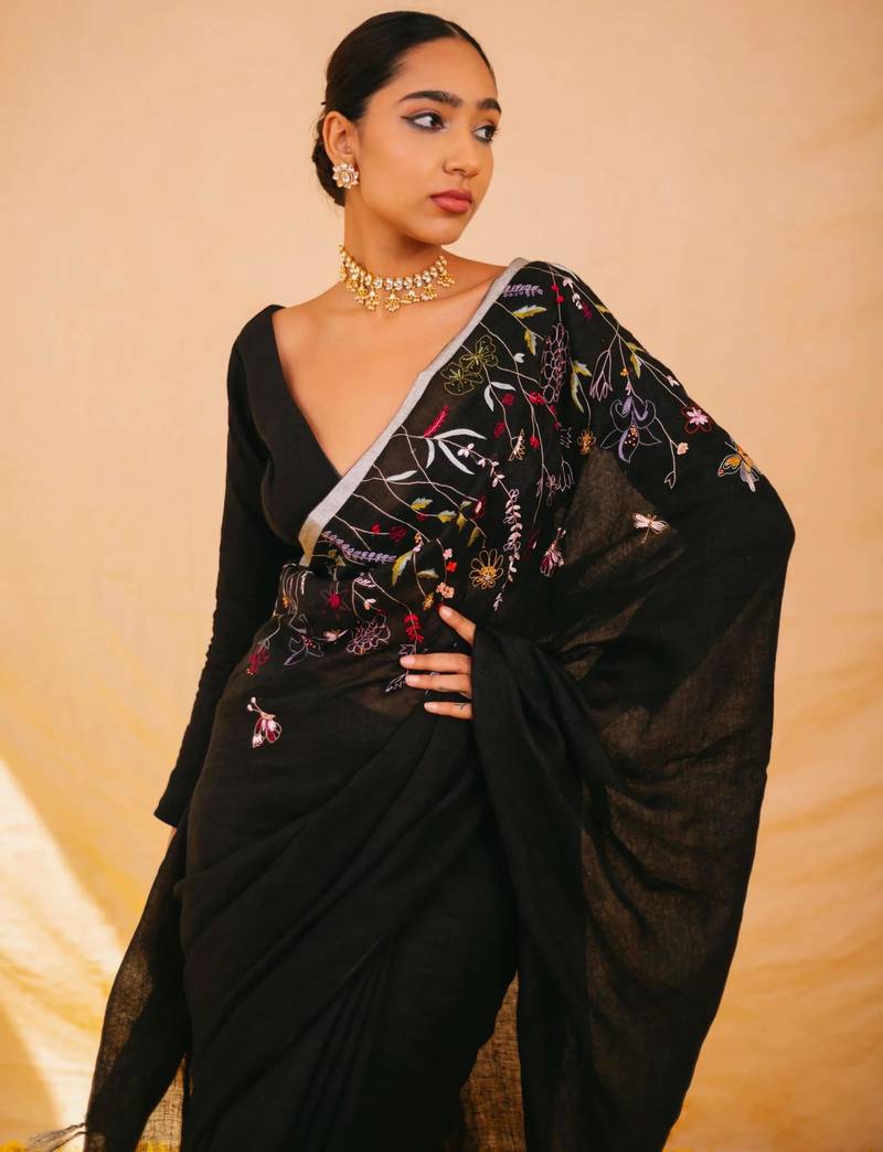 Black handloom linen saree with hand embroidered work
