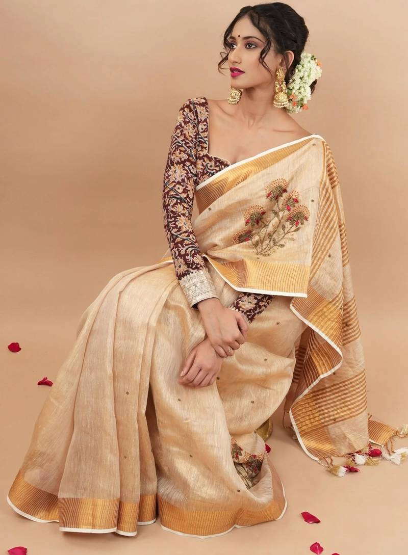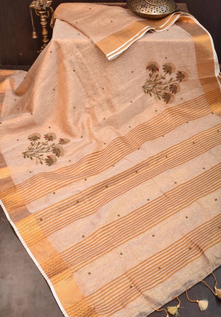 | Product Name | Golden Tissue Linen Saree With Hand Embroidred Work | |