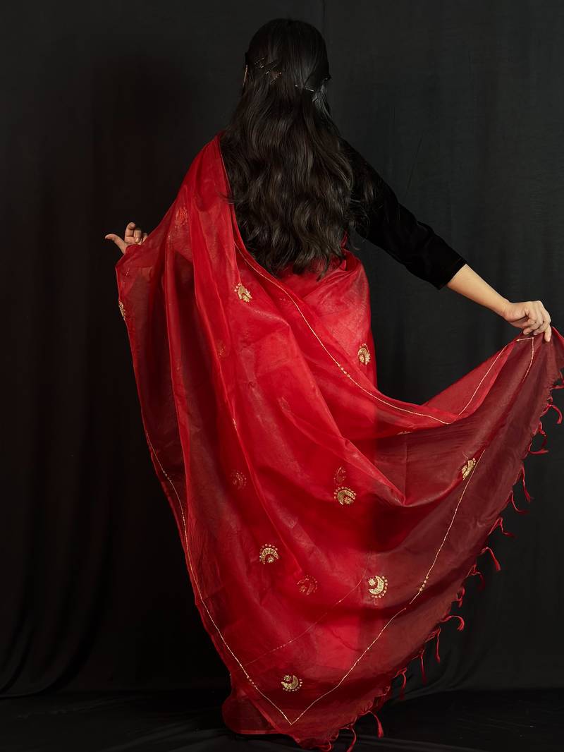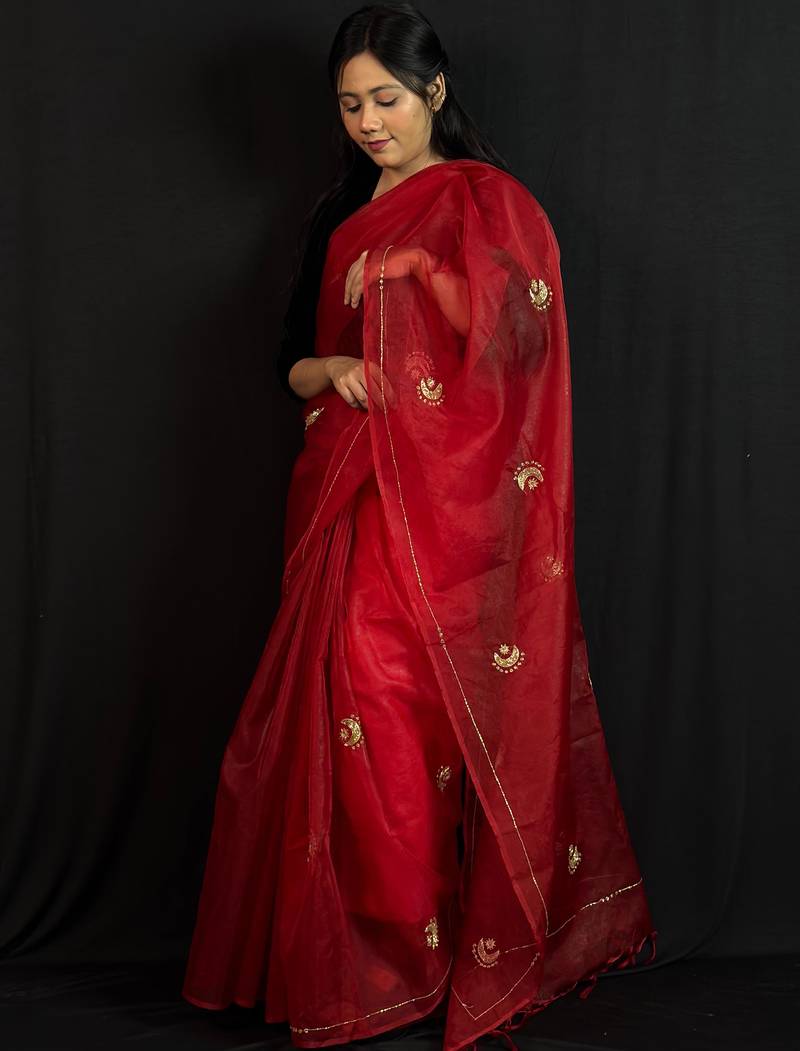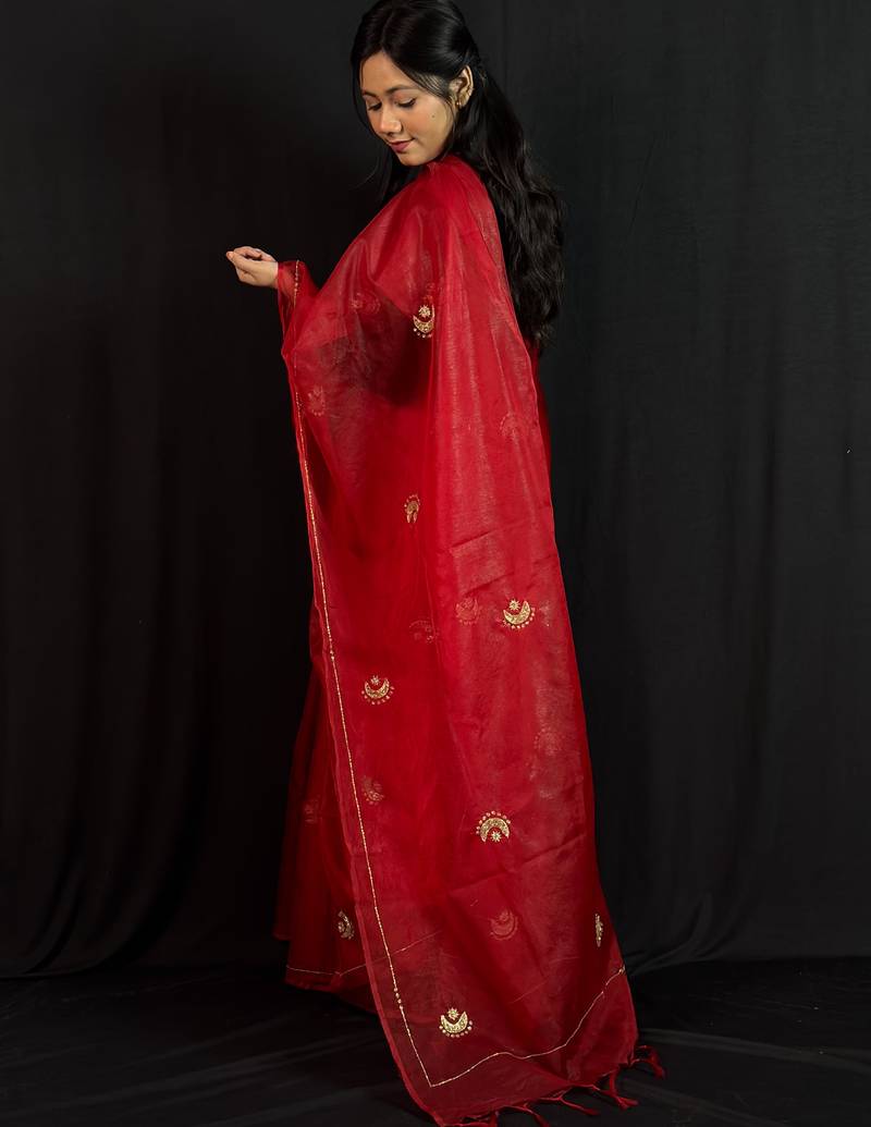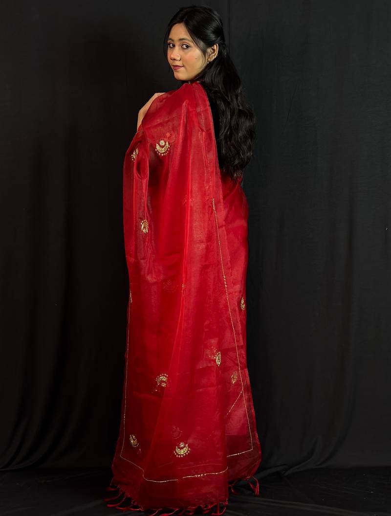 Red organza saree with hand embroidered work