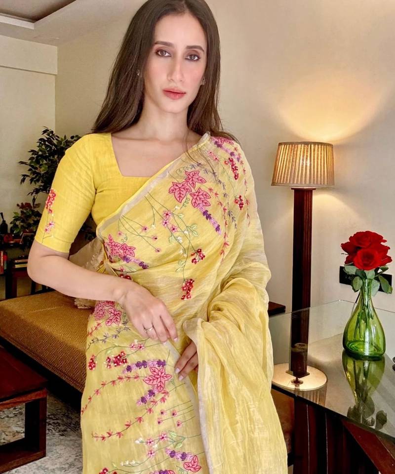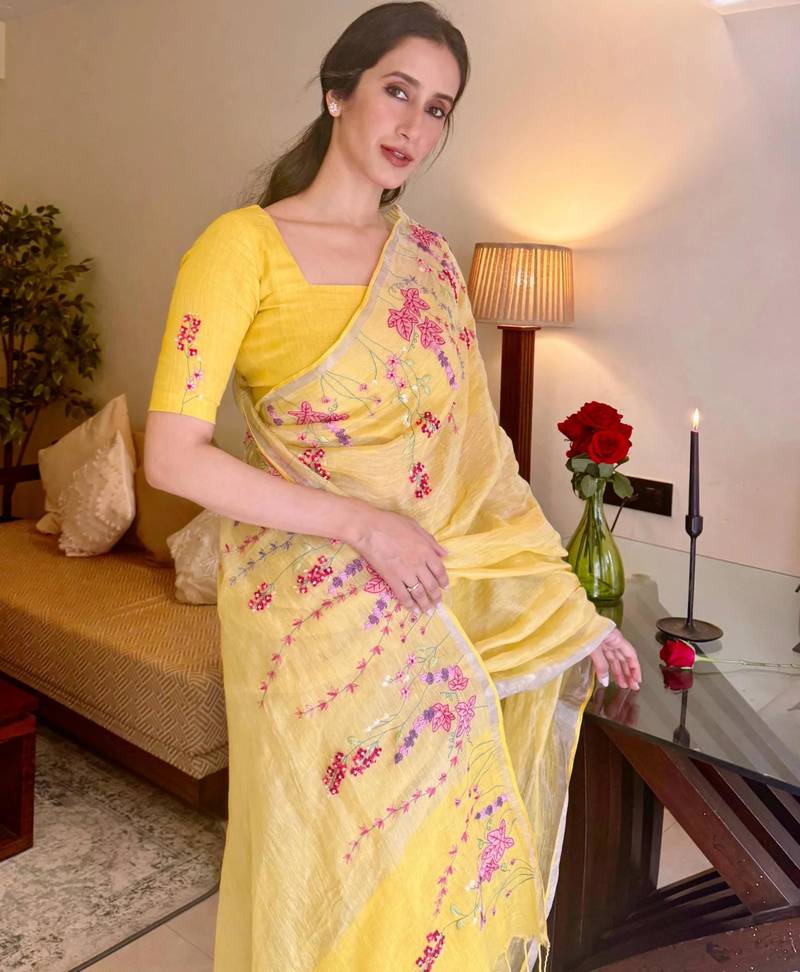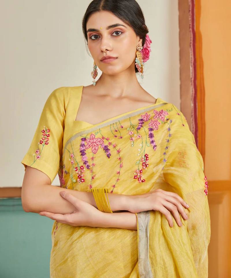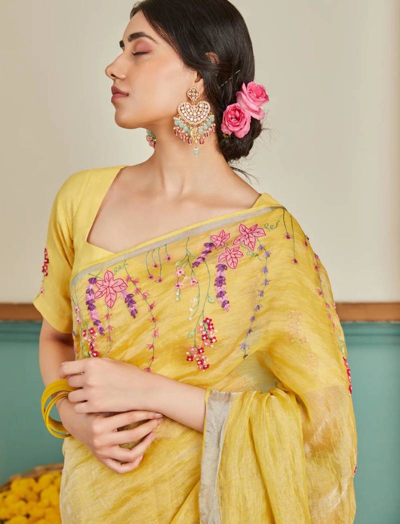 | Product Name | Yellow Handloom Linen Saree With Hand Embroidered Work | |