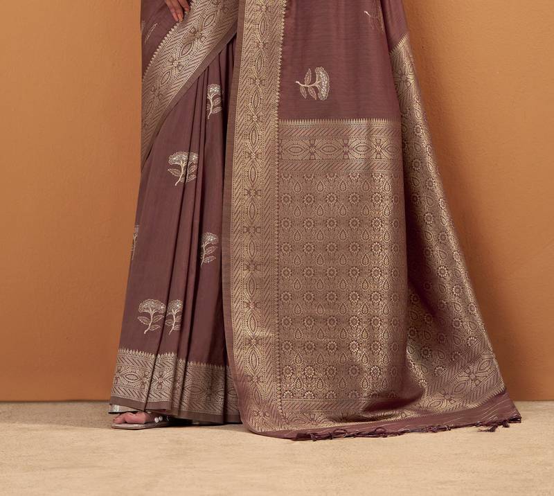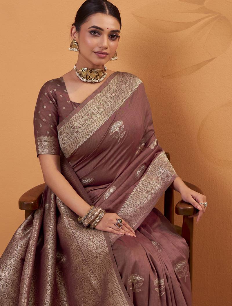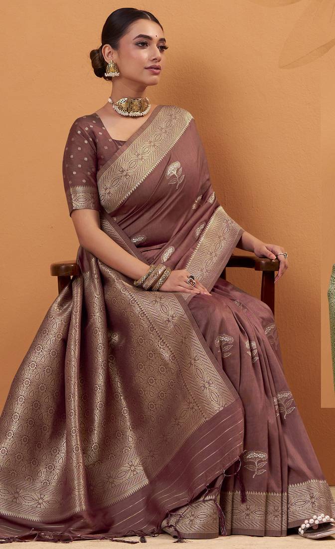 Brown tissue silk blend woven saree with unstitched blouse piece