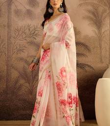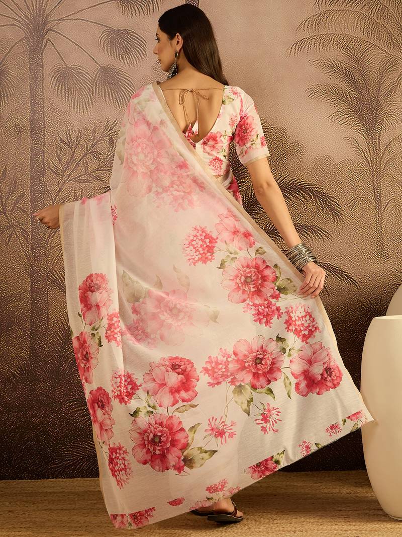 Cream chanderi cotton printed saree with unstitched blouse piece