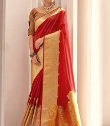 Red soft silk blend woven saree with unstitched blouse piece