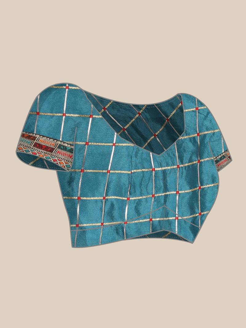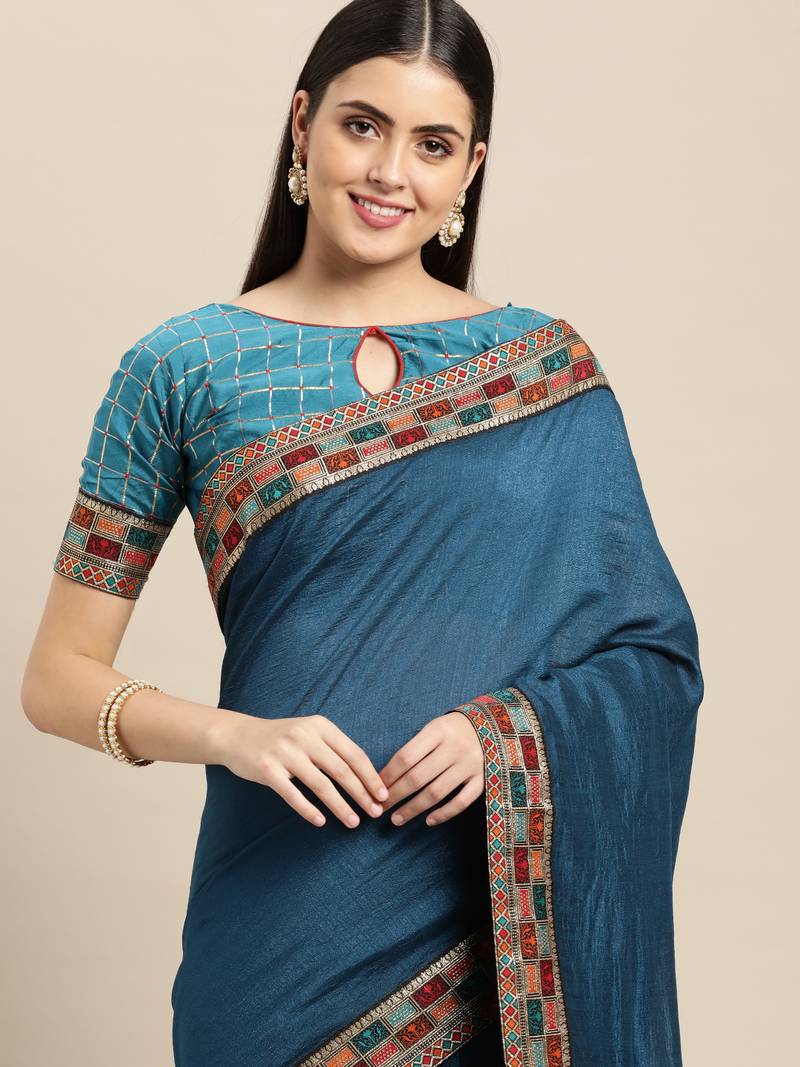 Teal plain poly silk saree with blouse