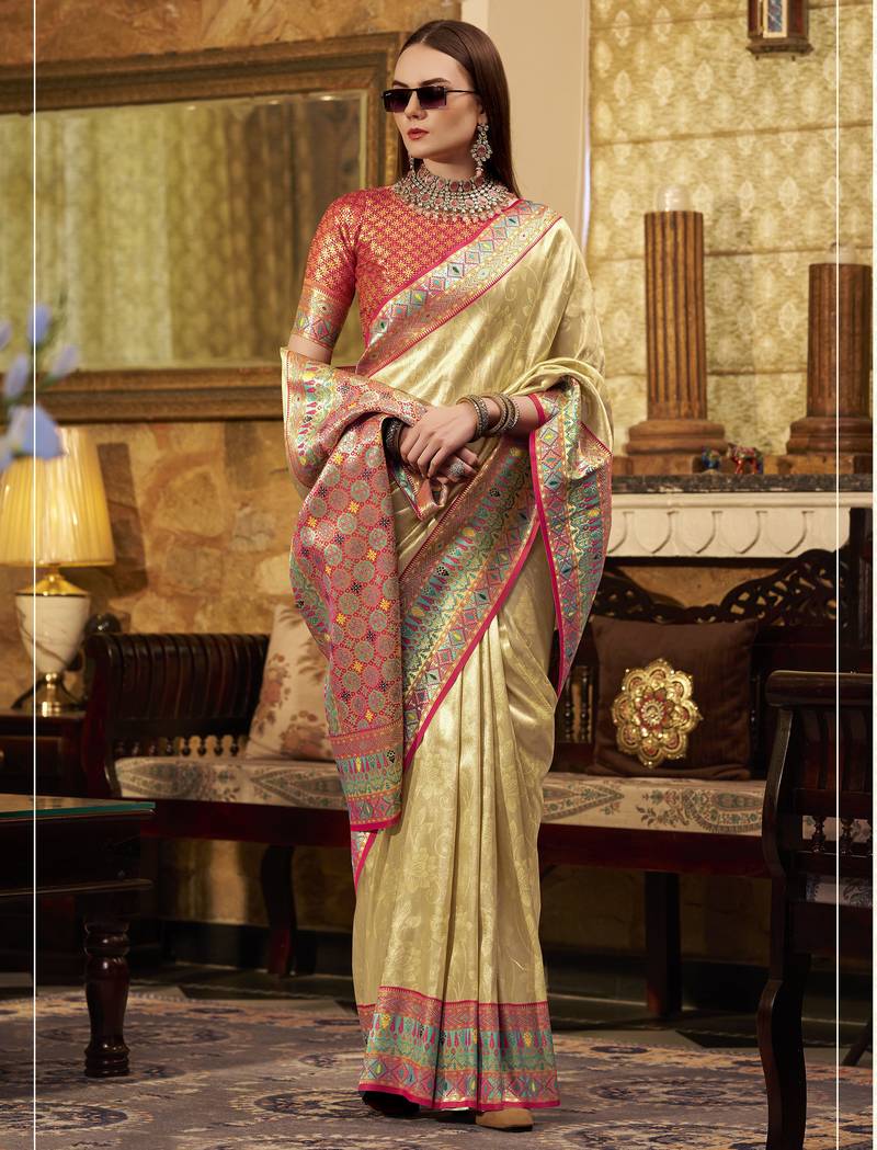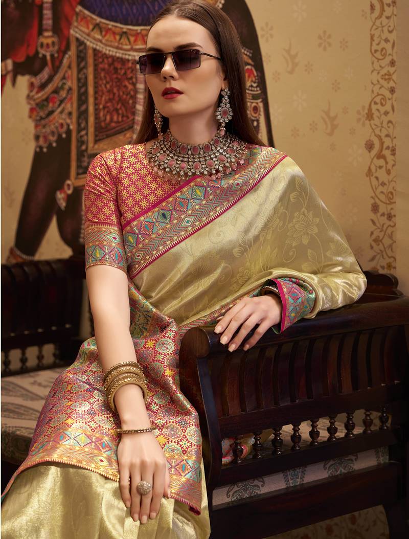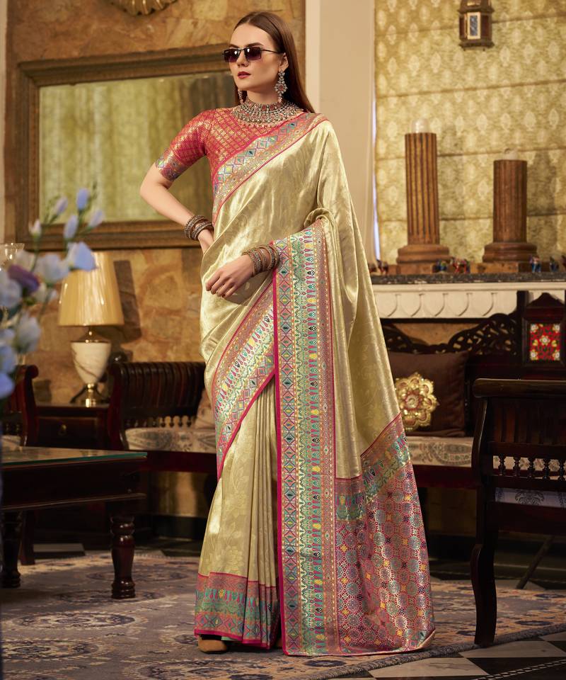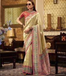 Women's beige tissue silk zari woven saree with unstitched silk blouse piece