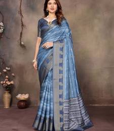 Women's blue dola silk blend digital print saree with unstitched blouse piece