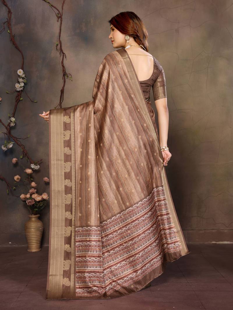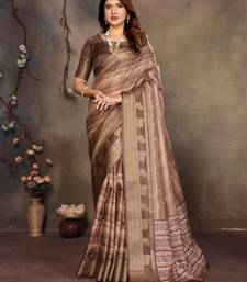 Women's brown dola silk blend digital print saree with unstitched blouse piece