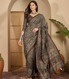 Women's brown silk cotton foil print saree with unstitched blouse piece