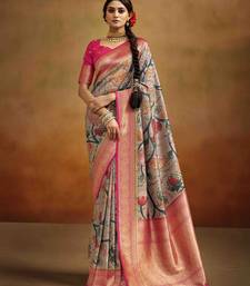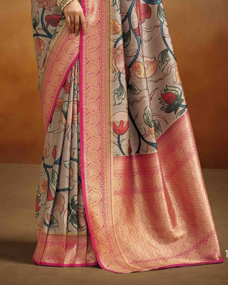 Women's brown tissue silk kalamkari saree with unstitched silk blouse piece