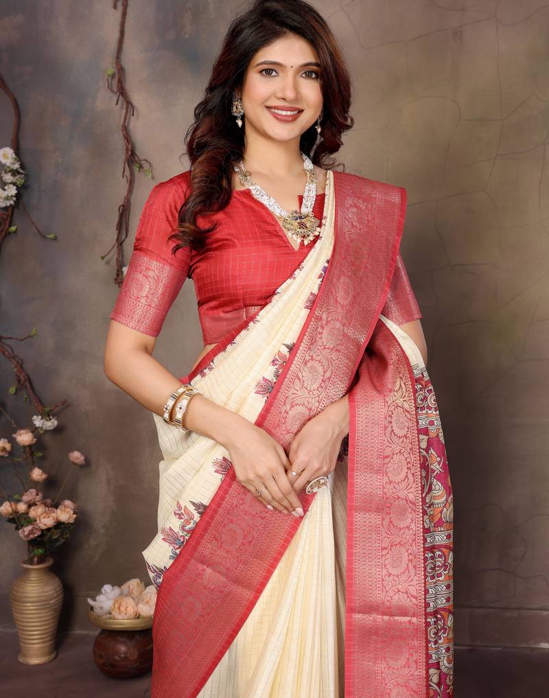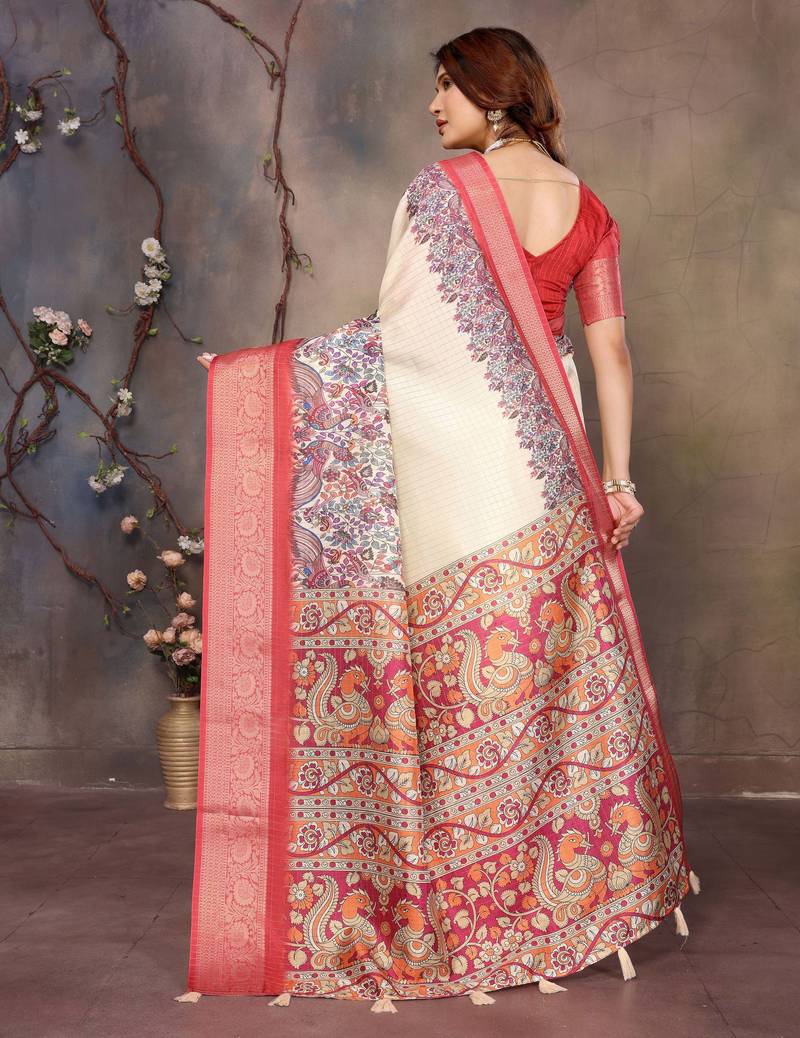 Women's cream dola silk blend digital print saree with unstitched blouse piece