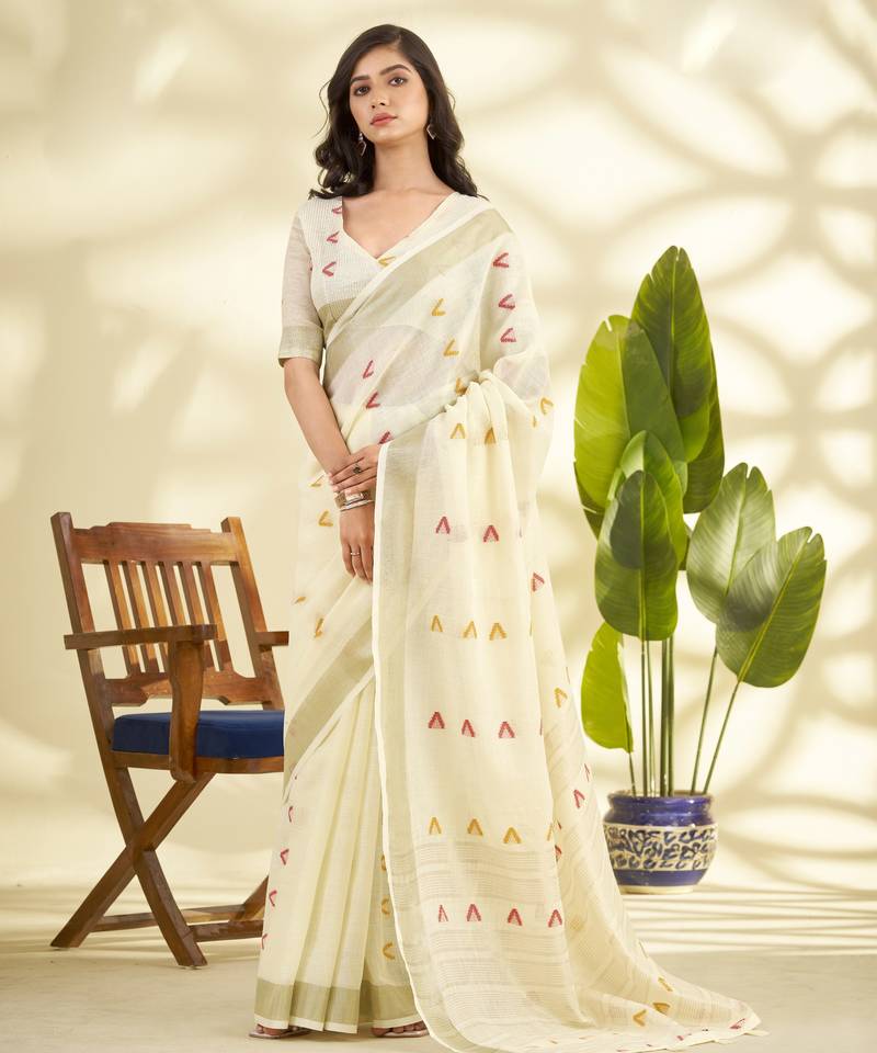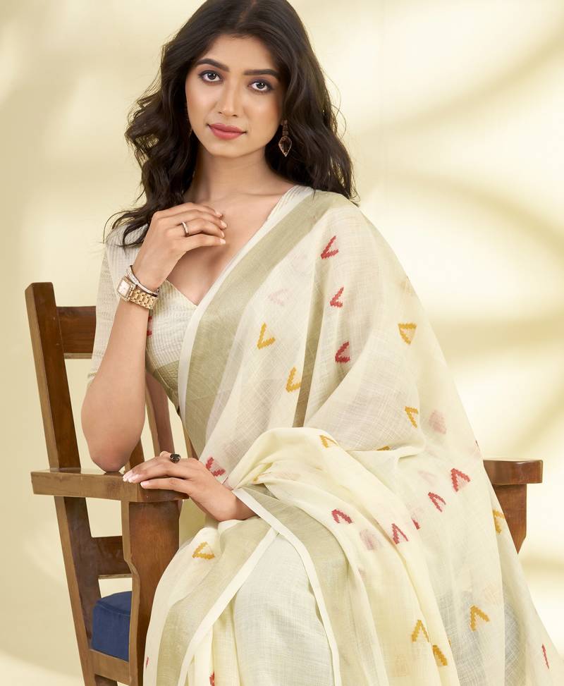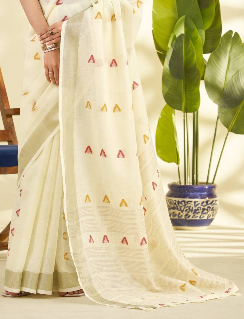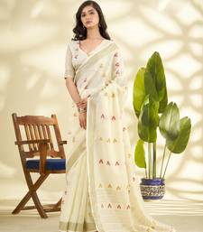 Women's cream linen silk woven saree with unstitched silk blouse piece